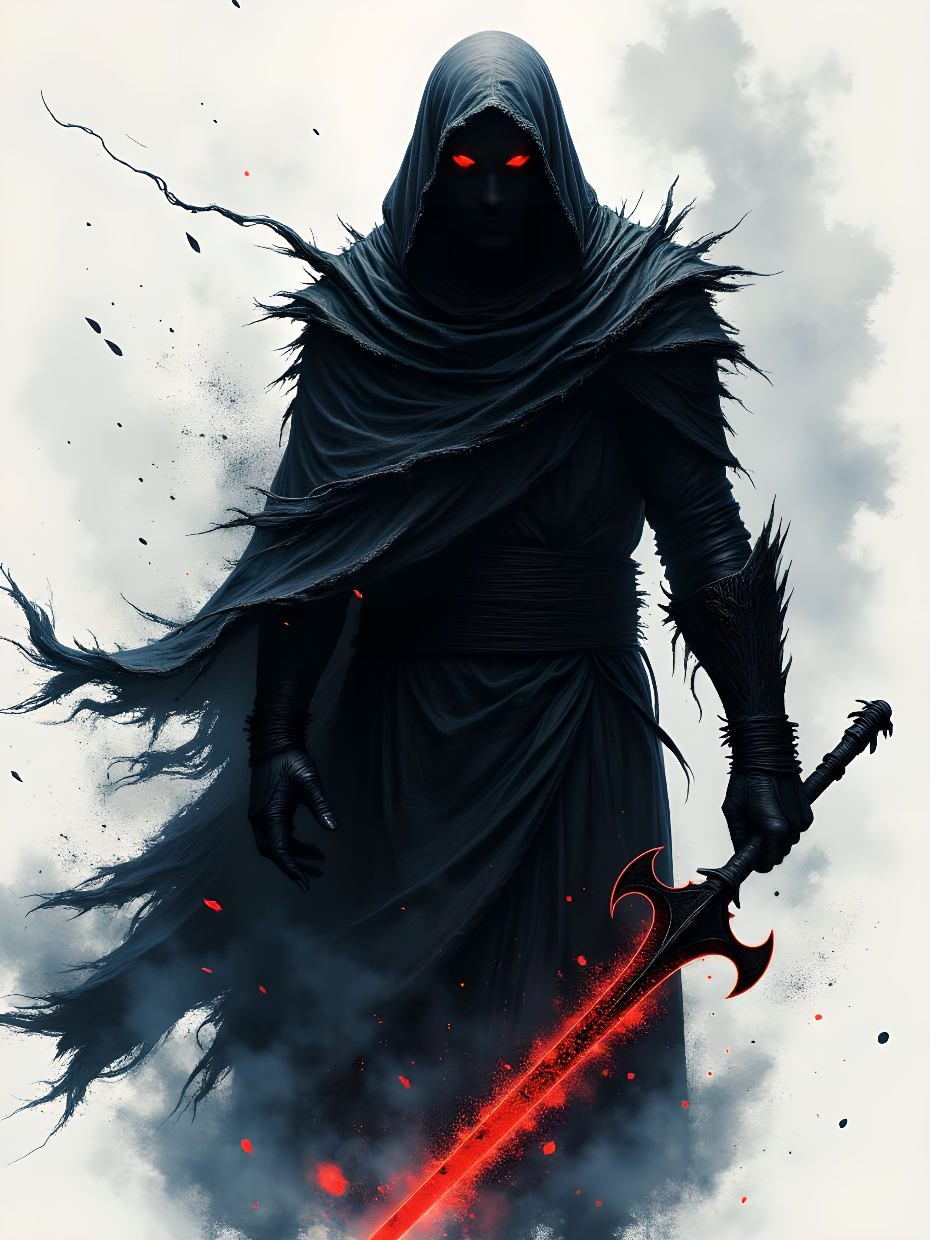 An atmospheric, ink-wash-style scene showcasing a dark, hooded figure draped in a tattered cloak. The figure's imposing silhouette exudes an aura of menace and mystery, with faint glimpses of jagged, worn armor visible beneath the cloak. In one hand, the figure grips a long, ominous scythe that emanates a ghostly, fiery glow despite its dark, shadowy form. The blade of the scythe gleams with deadly sharpness, further amplifying its ominous presence. The hood obscures the figure's face completely, except for two piercing, fiery red eyes glowing intensely within the shadowed void of the hood. The scene is composed in a predominantly black-and-white palette, enriched with shades of gray for depth and texture. Vibrant red highlights draw attention to the glowing eyes and the faintly illuminated scythe. The abstract background is filled with swirling wisps of shadows, splatters of ink, and flowing gusts of divine wind painted in subtle shades of blue, creating a dynamic, otherworldly atmosphere. The ink-wash painting style adds a raw, artistic edge to the composition, blending traditional and modern elements seamlessly. aidmaimageupgrader, aidmaMJ6.1m, detailmaximizer, mythp0rt, ne0nfant4sy, drkfnts <lora:aidmaImageUpgrader-FLUX-V0.2:0.8> <lora:aidmaMJ6.1_aidmaMJ6.1-FLUX-v0.4:0.8>