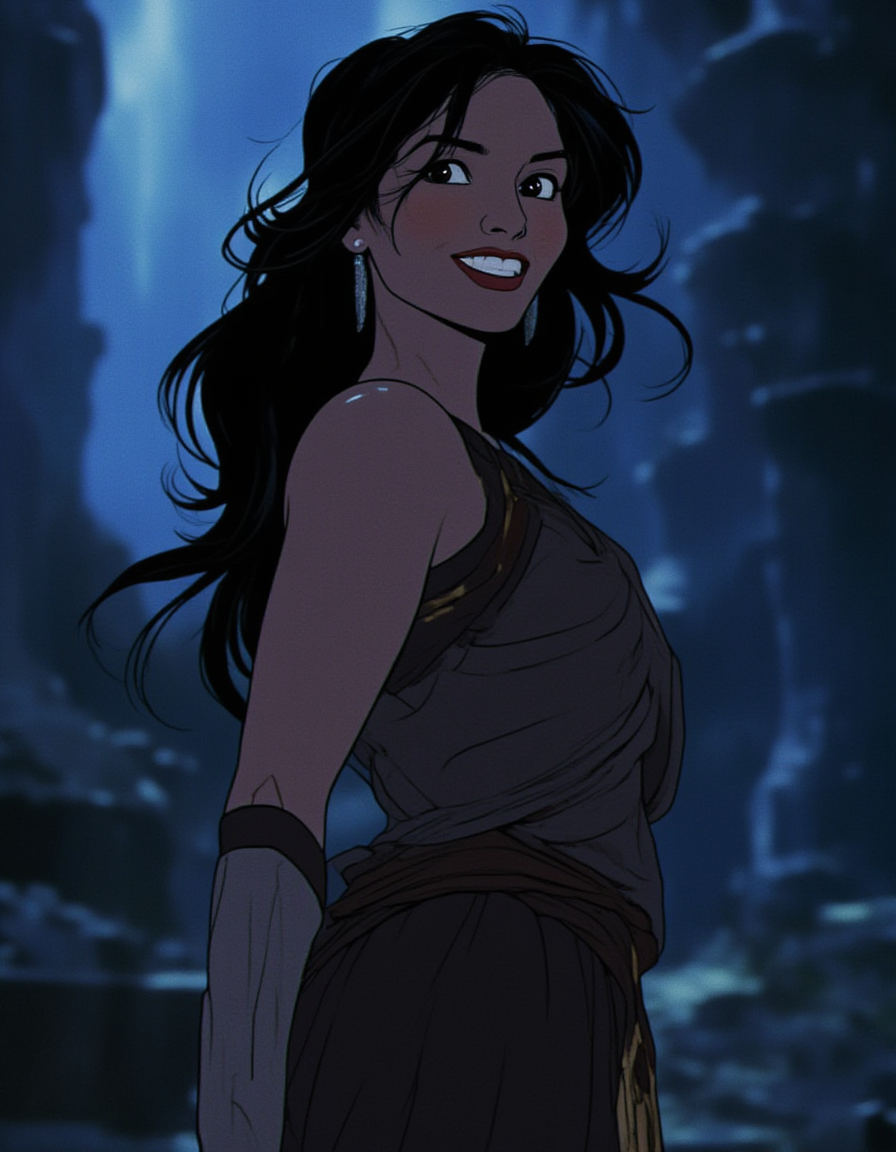 Disney anime, Disney Morph, Disney Style, (2D Animation), (Close view, three-quarter portrait), SFW. An ancient Roman temple. A tall woman in a Roman tunic, fully clothed. Tiara on her head, long black hair. playful mood., smiling. Dynamic pose.. mythp0rt, nigiex. katrina_law, The background is a gradient of shadowy blue tones, amplifying the ethereal and futuristic ambiance of the scene. (Depth of field), mythp0rt,