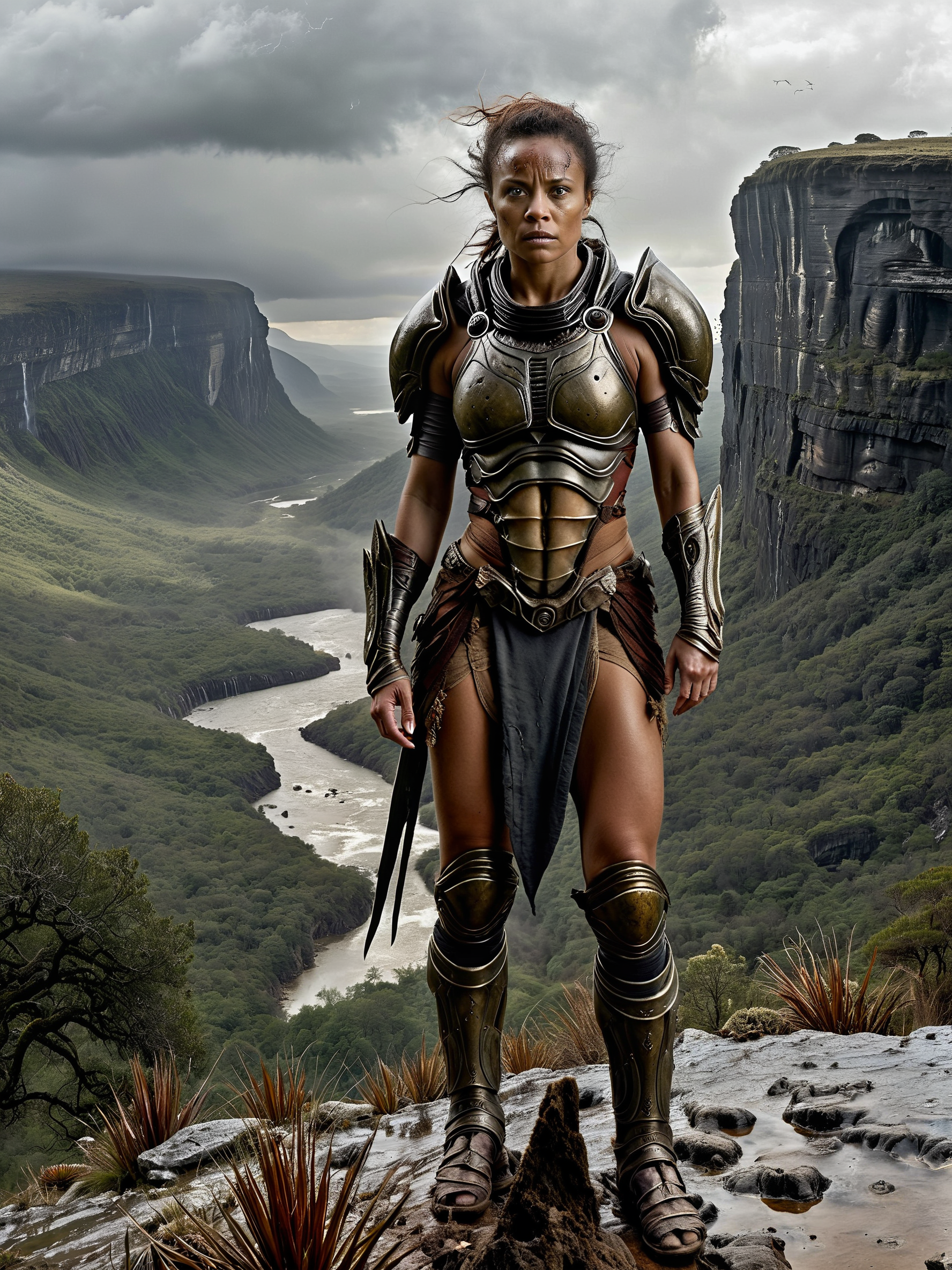 a seasoned female warrior standing on a rocky precipice overlooking a vast, serious and sexy, sunlit alien landscape valley dotted with ancient ruins and dense forests. Her armor, worn and tattered, carries the scars of countless battles. The distant roar of a waterfall mingles with the calls of unseen creatures, creating an atmosphere of both serenity and tension. Overhead, storm clouds gather, their deep grays contrasting with the vibrant tones of the alien landscape below, 8k, photorealistic, photorealism, uhd, ultra-detailed, photography, f/8 photo