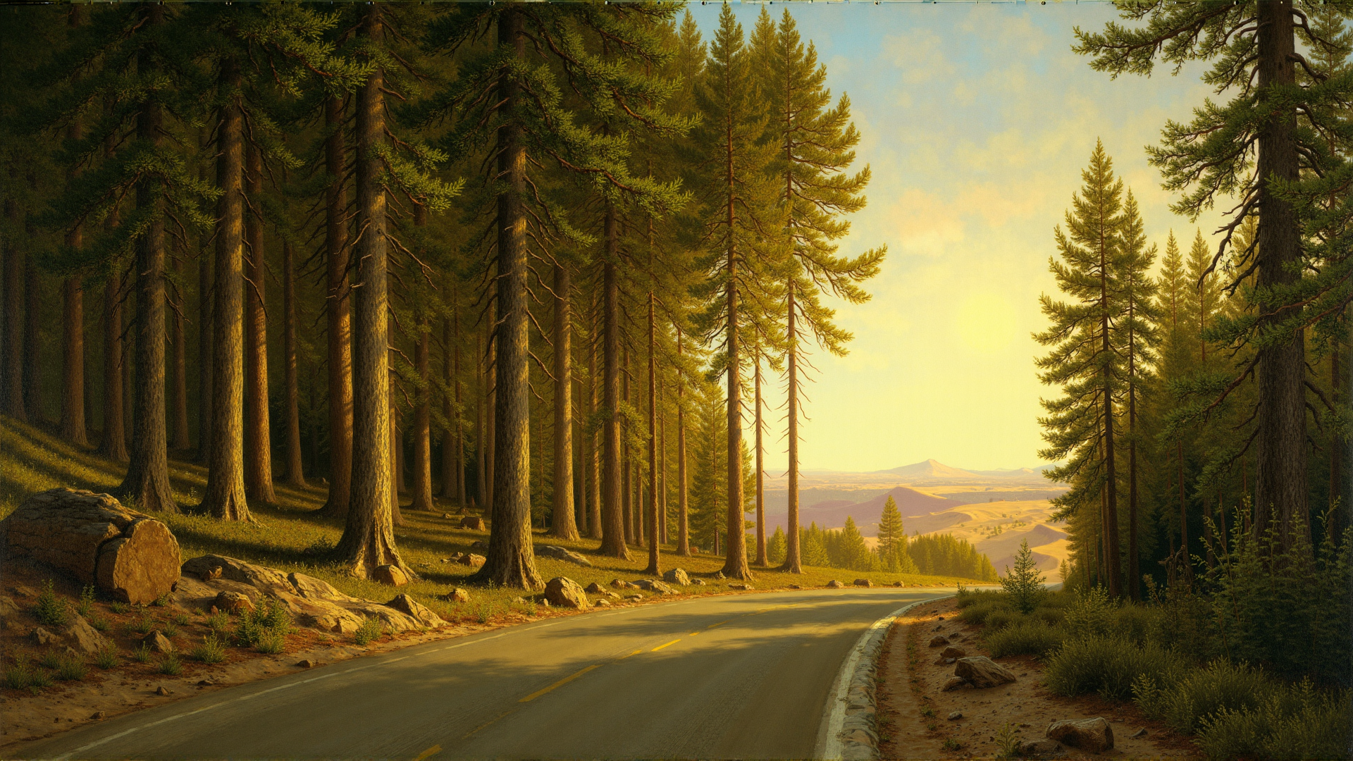 painting in the style of Albert Bierstadt. An asphalt road cuts through the middle of a dense forest, with tall trees on either side forming a lush, green wall. The morning sun filters through the foliage, casting vivid, golden rays that illuminate the road and forest floor. In the distance, the forest transitions into a striking desert landscape, where rolling dunes stretch under the warm glow of the sun. The scene captures a surreal contrast between the dense, shaded forest and the vast, sunlit expanse of the desert, creating a unique and tranquil atmosphere.