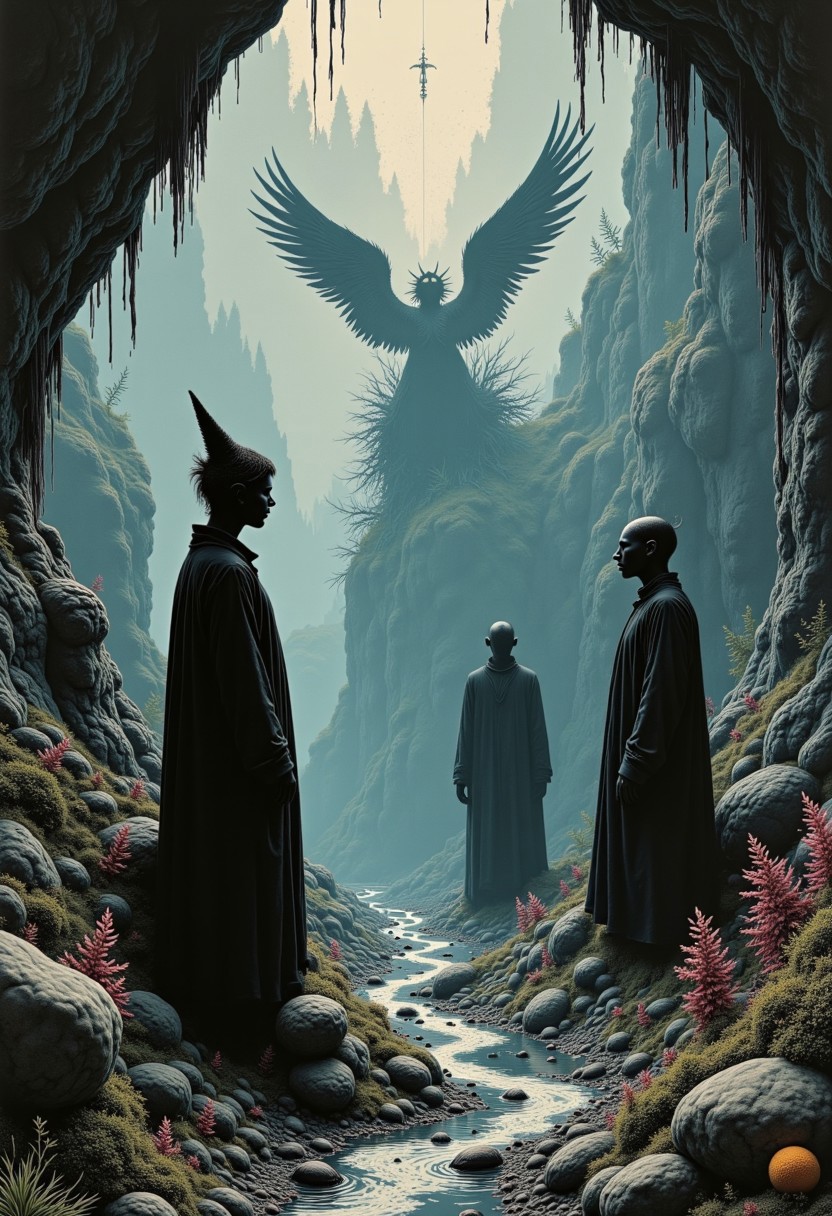 An enigmatic composition bathed in soft, diffused light, blending whispers of surrealism and melancholia. The scene unfolds in a cinematic atmosphere where subtle textures and delicate grains add depth, while the interplay of light and shadow enhances the quiet intensity of the moment. A subdued color palette merges with ethereal haze, evoking a dreamlike quality and timeless stillness. The central subject – "The Holographic Revue": A cabaret troupe performs against a backdrop of swirling nanobot clouds that shape-shift into fantastical settings—floating cities, alien landscapes, and shimmering waterfalls—each dissolving into particles as the performers move.– is delicately framed, their presence balanced between mystery and intimacy. Surrounding elements, rich in symbolic undertones, anchor the narrative in an otherworldly context. Organic details like softly swaying flora or faintly glowing surfaces contrast with stark, haunting figures, creating a juxtaposition that is both poignant and surreal. The composition invites introspection, with negative space amplifying the mood's resonance. Every detail, from the atmospheric depth to the muted highlights, serves to craft an image that feels suspended in an emotional, poetic realm. surreal style