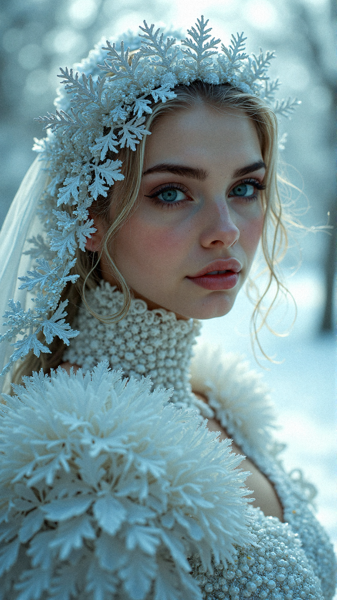 Ethereal Bride in a Frosted Wonderland Extreme emphasize on photorealistic, realistic detail, realistic reflection detail and realistic background detail.