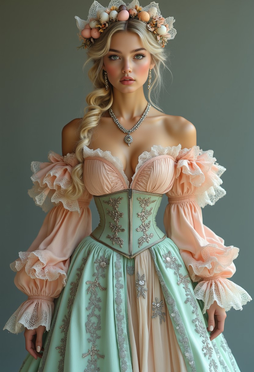 The image is a high-resolution, highly detailed digital painting of a young woman with a fair complexion and long, wavy blonde hair styled in loose curls cascading down her back. She is dressed in an elaborate, vintage-inspired outfit reminiscent of Victorian or Steampunk fashion. Her attire includes a light peach off-the-shoulder blouse with intricate lace detailing, featuring a sweetheart neckline and long, puffed sleeves adorned with delicate lace cuffs. The blouse is paired with a corset-style bodice in a soft, mint-green fabric, adorned with silver embroidery and lace trim.
