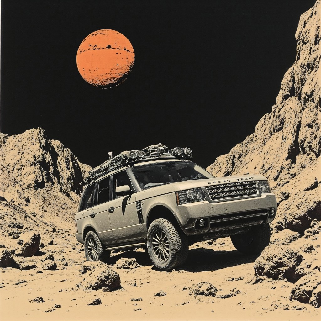 A Range Rover trudging along through a lunar landscape (Illustration)