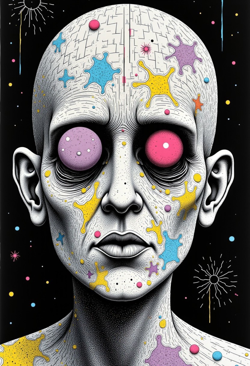 A black and white illustration, abstract dystopian style, chiaroscuro dark ambient light. Abstract portrait of old peoples. The whole face is split in white rectangles separated by black lines and spaces. Random rectangles are filled with hundreds of handwritten numbers or symbols of all size. Colored shapes are printed with transparency on top of all that with Japanese woodblock technique. Some areas are scraped away, revealing the texture of the paper.