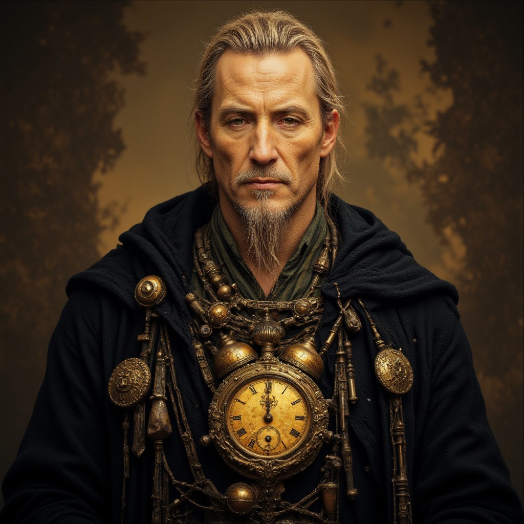 An older man with gold skin who is a wizard that wears a clock round his neck and a robe. His hair blonde and a blonde beard. R3alisticF