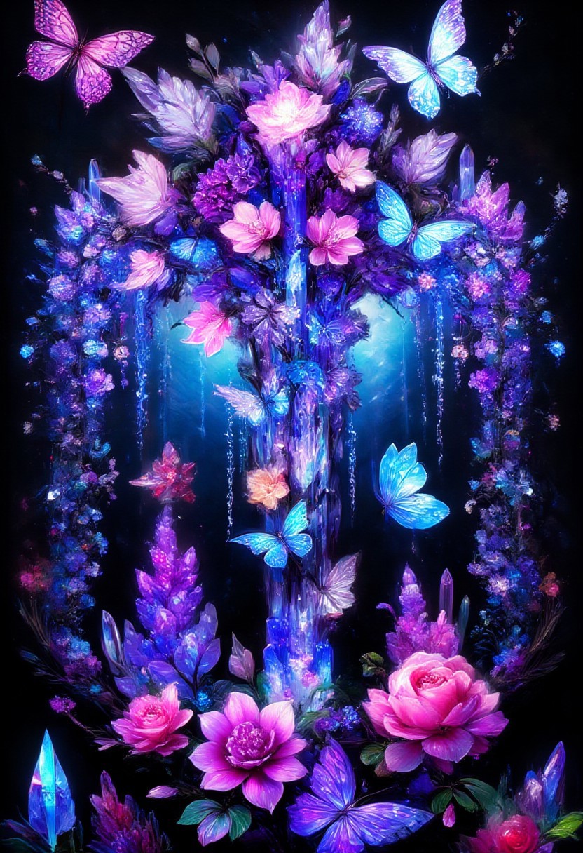 made of sparkling amethyst crystal,chinese blue wisteria and glowing blue butterflies, glowing pink and yellow butterflies against a pitch-black background Painterly, surreal, vibrant glow, bokeh, 8k,Pink_Roses, blue_flower,pink_flower,white_flower,yellow_flower,grappe_flower,cherry blossoms,red_flower,purple_flower,back_roses,made of sparkling amethyst crystal