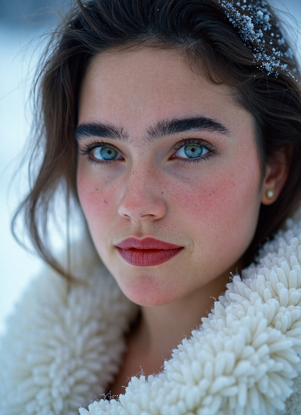 A hyper-realistic, fine art portrait of a young woman set against a serene, icy backdrop, captured with the timeless quality of Fujicolor Superia X-TRA 400 film and a 50mm lens. Her flawless skin glows with a natural, luminous quality, enhanced by the soft, diffused lighting that highlights her features with an ethereal radiance. The subtle grain of the film adds texture and a nostalgic depth to the image, giving it a timeless, tactile feel. Her piercing blue eyes dominate the composition, their crystalline clarity reflecting the snowy environment around her. They convey a sense of quiet strength and introspection, framed by thick, perfectly sculpted brows that add definition to her expressive face. Her slightly parted lips, with a soft, natural pink hue, reveal a gentle, contemplative demeanor. Her hair is pulled back loosely, with a few delicate strands falling around her face, gently touched by the cold. Snowflakes rest naturally on her hair and shoulders, their intricate patterns sparkling softly in the light. The interplay of snow and light creates a magical, almost surreal atmosphere, further emphasized by the prismatic refractions and subtle highlights scattered across the frame. She is dressed in a soft, white, fur-trimmed garment that blends seamlessly into the snowy environment, its textures complementing the intricate details of the snowflakes that cling to her clothing. The background is a blur of icy whites and soft greys, achieved through the shallow depth of field provided by the 50mm lens, isolating the subject and creating a dreamy, serene ambiance. The lighting is soft and natural, with a cold, bluish tint that enhances the wintry feel while preserving the warmth in her complexion. The balance of light and shadow adds depth and dimension, drawing the viewerâs eye to the fine details of her face, the delicate snowflakes, and the textured softness of her attire. This image embodies the essence of fine art photography, combining the rich, vibrant tones of Fujicolor Superia X-TRA 400 film with the intimate perspective of a 50mm lens. The subtle grain and tactile quality of the film create a sense of timeless beauty, blending the natural elements with the subjectâs ethereal presence to evoke a serene, poetic narrative. Tags Integrated: Fine art photography, subtle grain, Fujicolor Superia X-TRA 400 film, 50mm lens, ethereal atmosphere, serene mood, snowy environment, intricate textures, dreamy lighting. <lora:Jennifer_Connelly_1990-000032:1.0>