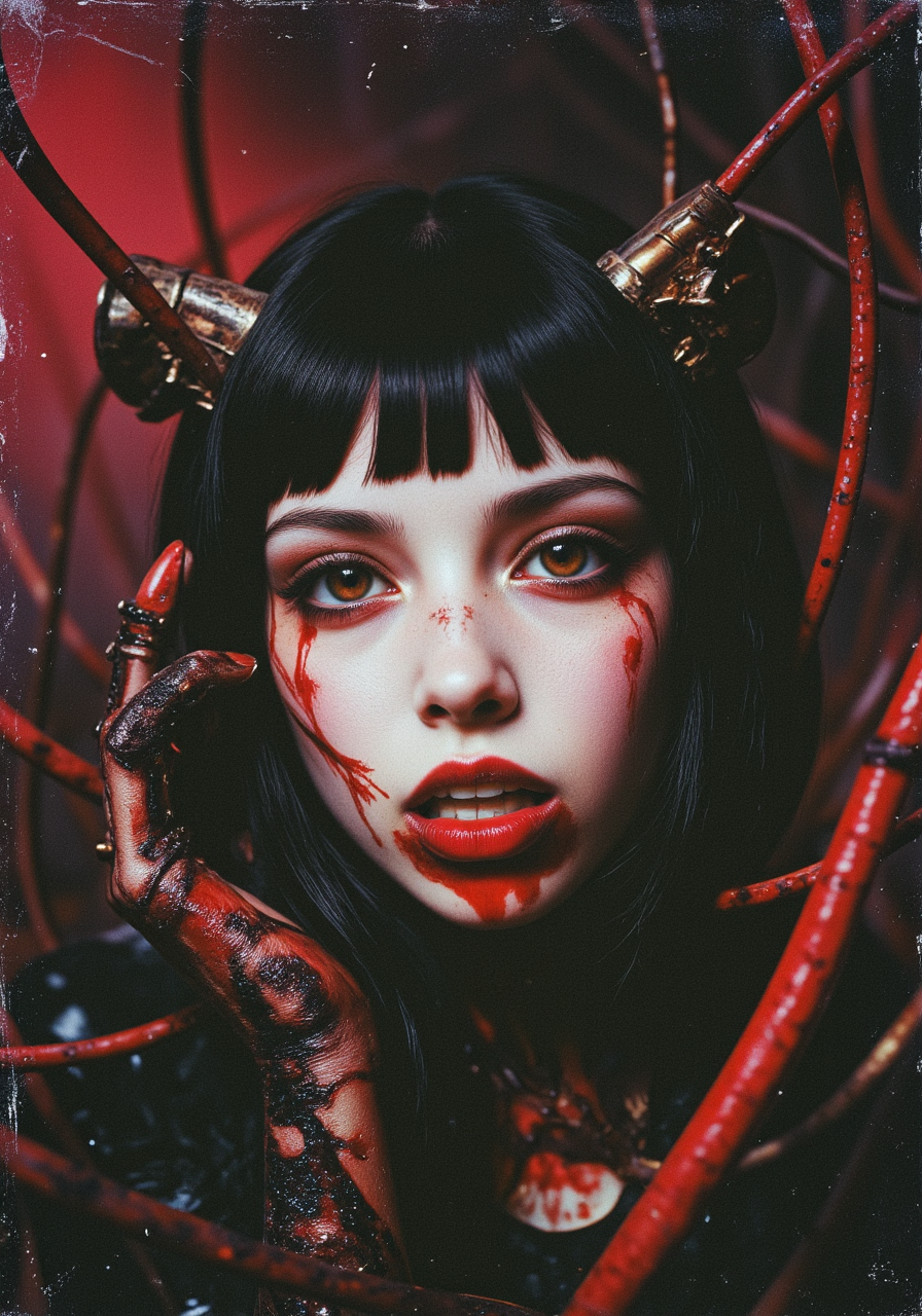 A realistic depiction of a biomechanical vampiress, ravenous and half-mad, with short, straight bob-styled hair. Her makeup is smeared, creating a haunting, blurred effect around her eyes, and her chin is smeared with fresh blood. Her skin is pale, almost porcelain-like, with areas where flesh merges with metallic and organic elements: gears, pipes, and wires protrude from beneath her skin, creating a terrifying contrast between the human and the mechanical. Her eyes burn with a bright red glow, and her lips are slightly parted, revealing sharp fangs. She stands in semi-darkness, surrounded by biomechanical structures reminiscent of H.R. Giger’s works: pulsating veins, metal spikes, and organic forms that twist and writhe around her. In the background, a dark, industrial landscape stretches out, with a foggy, blood-red sky. Every detail—from the texture of her skin to the blood droplets on her chin and the biomechanical elements—is rendered in hyper-realistic detail, creating an atmosphere of horror, madness, and dark beautye essence of both celestial elegance and a hint of the unexpected aidmaMJ6.1 an expired film photograph of style_of_fo9lk12o0