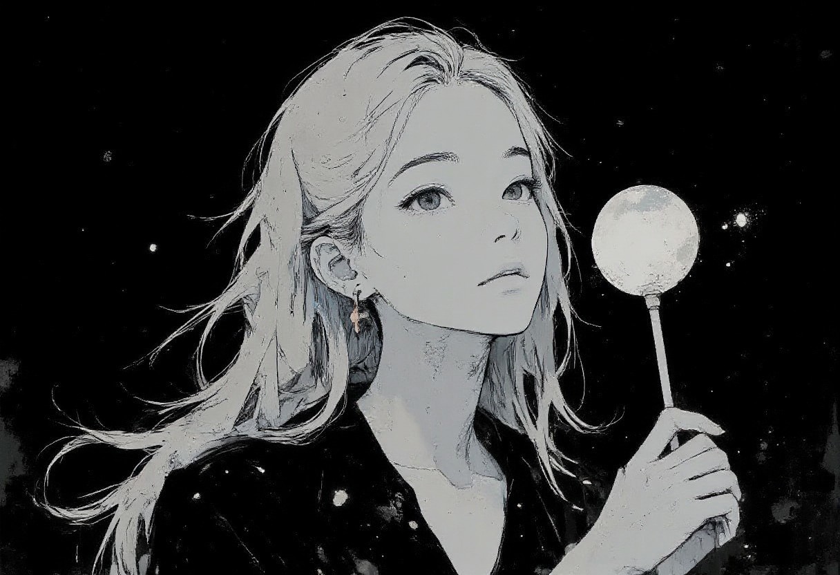 A high-contrast black-and-white anime-style illustration of a glamour woman with white skin in an artistic portrait composition. The woman is depicted at a slight angle, focusing on her elegant profile and lips. She is sensually enjoying a lollipop, creating an innocent yet sophisticated atmosphere. Her long, slightly wavy hair flows freely, framing her face beautifully. She has delicate facial features with expressive eyes and finely drawn lips. The lighting is dramatic with careful attention to shadows and highlights, creating depth and dimension. The background is minimalist dark, drawing full attention to the detailed character and the artistic presentation. The sharp contrasts emphasize the stylish and refined atmosphere of the composition.