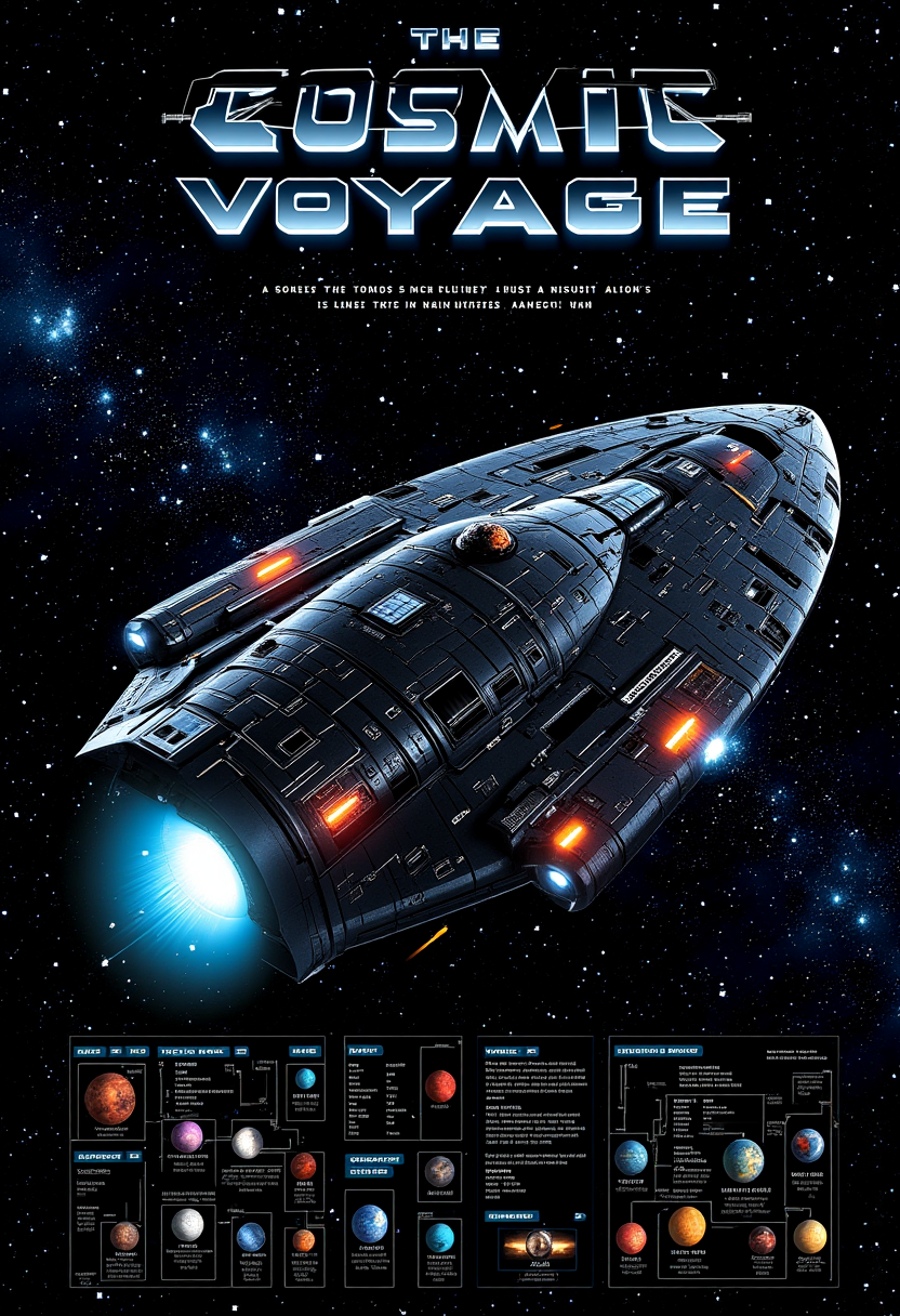 yfg-aarchy. Poster of a interstellar spaceship and a survey of all the alien planets it has visited. Space background. Title at top reads "the COSMIC VOYAGE" (Oblique angle:1.3).