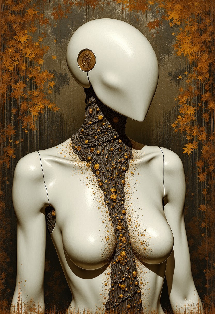 impressionist classical-style painting of a highly detailed, fantasy scene with a dramatic, robotic aesthetic. The central figure is a female robot. Her head and body are made of white, shiny and smooth metal with multi-colored, exposed wiring going down her neck creating an organic mosaic pattern. She is a biomechanical robot and there are wires jacked into her face. , WLOP, Moebius, H.R. Giger, Royo, warm colors, hyperrealism, digital illustration, demons, intricate, vapor, fantasycore, beautiful, complex, ethereal, golden ratio, holographic astral cosmic illustration mixed media by Pablo Amaringo