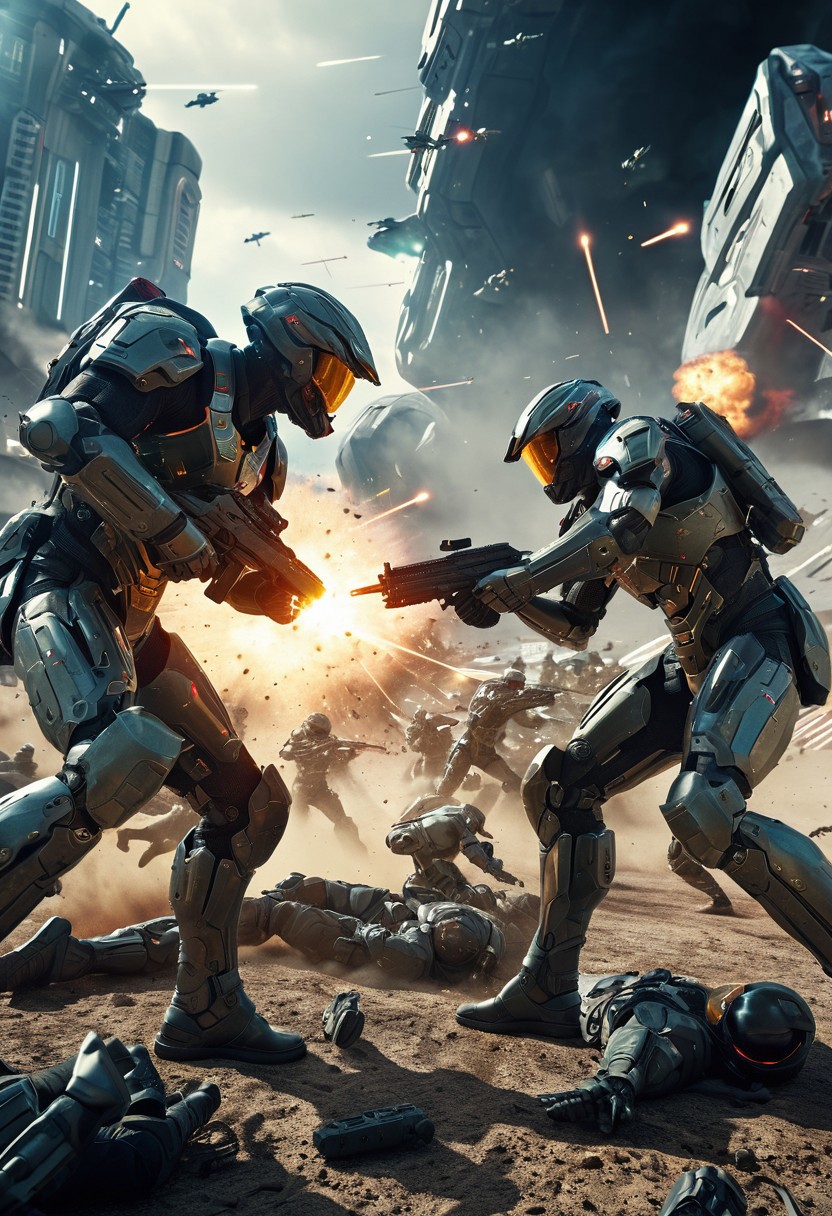 epic scifi battle scene, futuristic soldiers fighting, futuristic, intricate details, cinematic still, hyperdetailed
