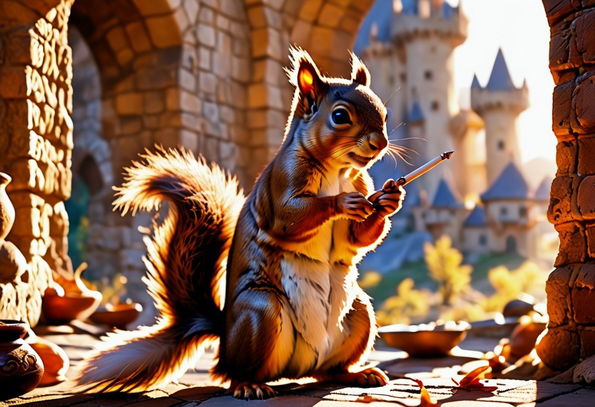 npcp squirrel, holding a quill and a long scroll, castle background, advntr, light and shadow by reij-snrs, style-sylvamagic