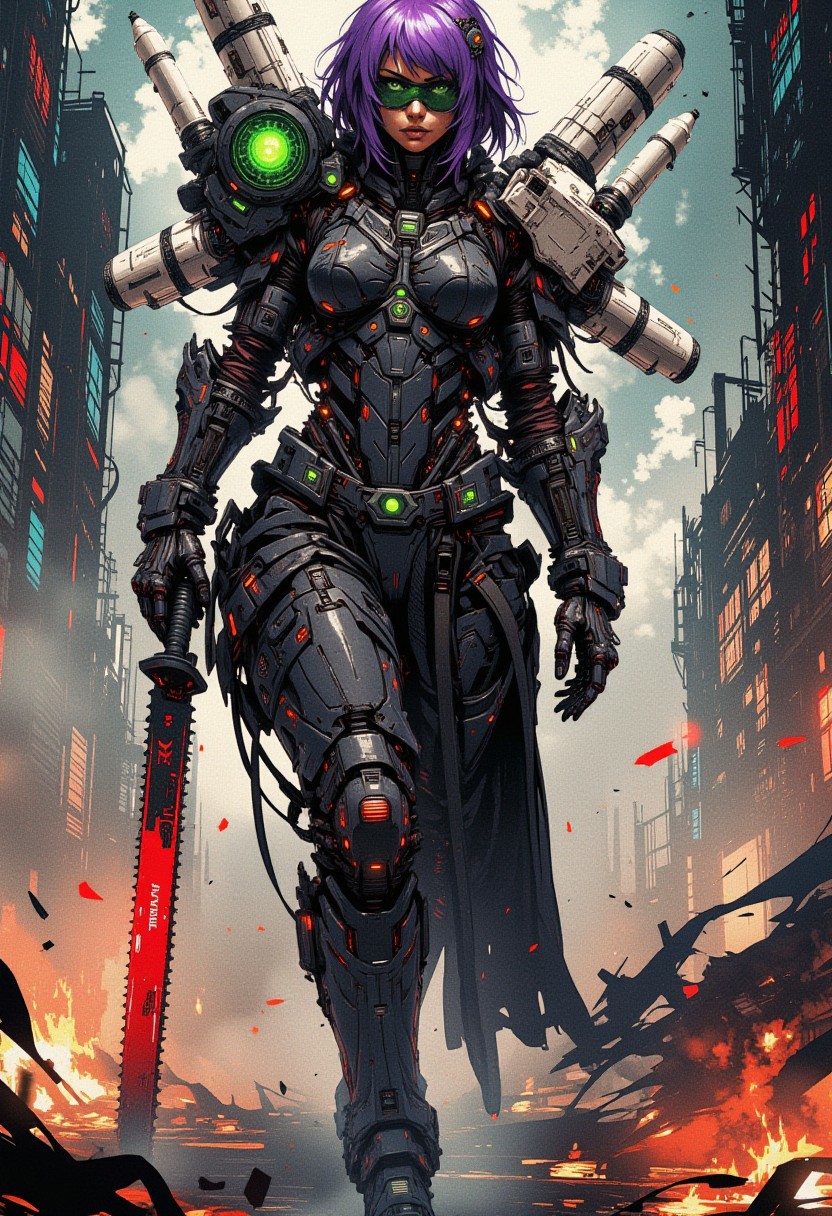 Full body view, long boots heels, A digital painting in the style of ck-js, nistyle, smoke mask, Green Glass with data and target in lens, black Full roman armor with two white four mechanical arms, missile launcher in shoulder like a mecha, hold red chainsaw Blade, purple short Bob hair, like eyes, Black lips with gloss, tan skin, large breasts, muscular, Far view