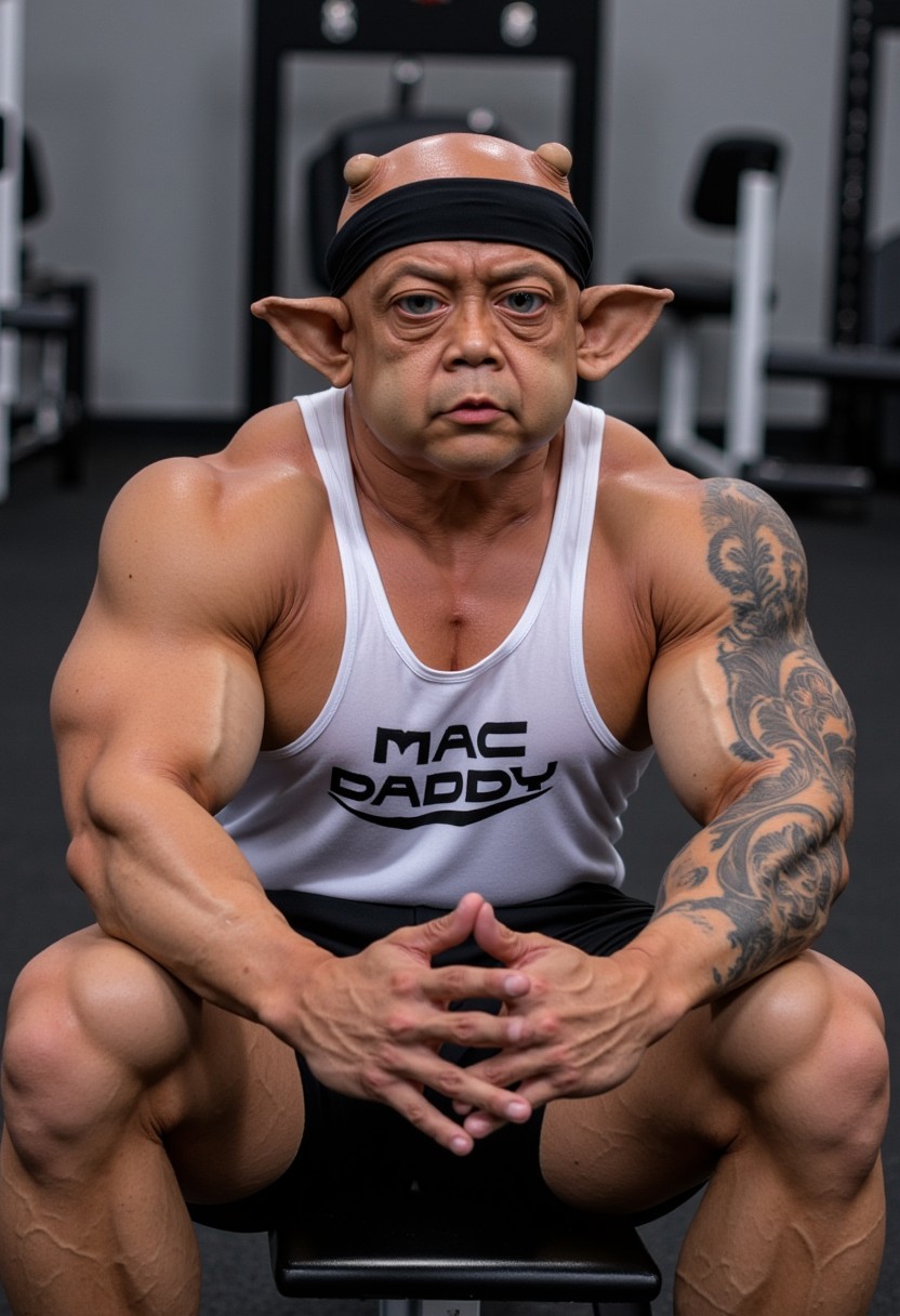 This is a high-resolution photograph of a muscular Mac the alien bodybuilder with an extremely massive, strong physique. Mac is wearing a black headband. Mac the alien has a broad, well-defined chest with prominent pectoral muscles, and his massive arms are heavily tattooed, visible on his biceps. His skin tone is pale, with visible veins and a slight sheen, indicating an unhealthy use of performance enhancers. Mac the alien is wearing a white sleeveless tank top that says "MAC DADDY" in black text, and black athletic tight shorts. He is sitting on a black gym bench, with his elbows resting on his knees and his hands clasped together. The background is a detailed gym, focusing all the attention on the subject. The lighting is bright and even, highlighting the contours of his muscles. The overall quality of the photography is high, with clear, sharp details and excellent color balance. Mac the alien is in a moment of concentration, looking at the camera. His physique is extremely defined with a very low fat percentage that makes all his muscle volume evident.