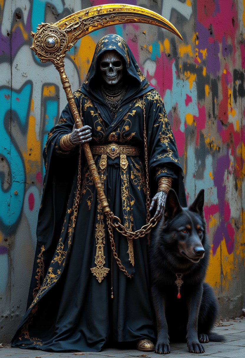 A hyper-realistic digital artwork of a futuristic fashion illustration featuring a slender, Grim Reaper, solo, adult, standing confidently against a graffiti covered wall background. His sinister skeletal visage contrasts with dark heavy robes, chunky gold accessories, enhancing his demonic presence. he wears an avant-garde, thick heavy woven robes decorated with gold embroidery and platinum filigree with sharp metallic edges and spikes, holding an intricate golden scythe. A large spiked chain leash connects to a Demonic Hell Hound beside him, its oily black coat and rich fiery markings gleaming. The dog's muscular frame mirrors his commanding presence, both exuding power and elegance. The scene blends demonic fashion with futuristic aesthetics, inspired by the industrial grit of *Blade Runner* and H.R. Giger’s surrealism, rendered in ultra-HD, 8K quality, hyper-detailed, flawless anatomy, and a professional finish—a dynamic, avant-garde masterpiece., aidmamj6.1, aidmafluxpro1.1