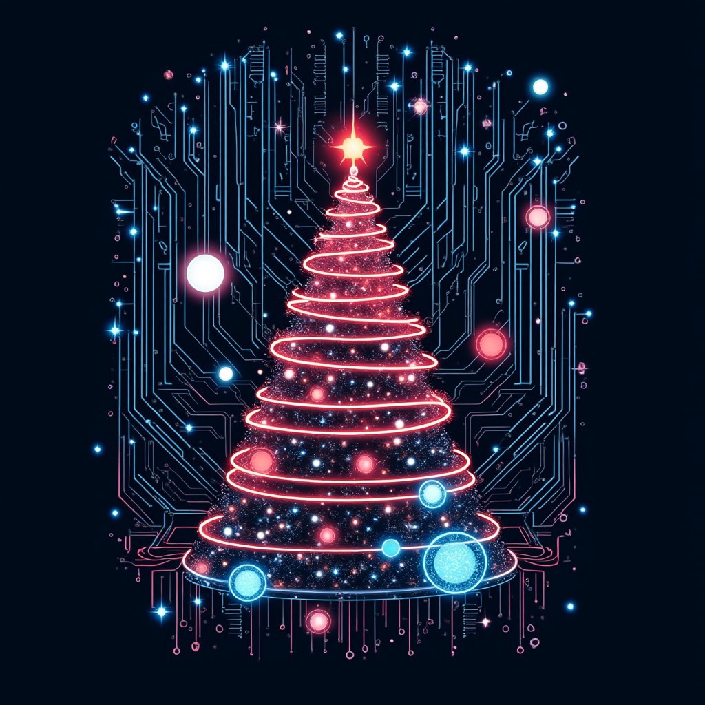 xmas_style_2K24, futuristic Christmas card. Background is circuit board. digital looking Christmas tree in the middle surrounded with tech elements like data Centre, cyber defense, artificial intelligence.