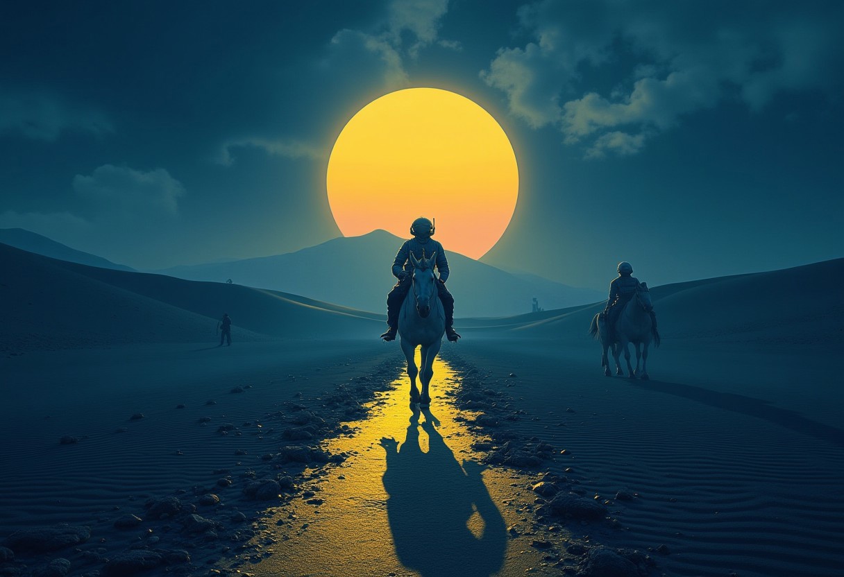 A closeup digital shot about dark fantasy scene with a black and navy-blue color theme. low angle camera view of the focal point is a lonely astronaut riding a unicorn approach the viewer in the endless desert and their silhouetted against the blue-tinted sand while sky is extremely dark and rough. The dunes stretch out into the distance, with the golden path they walk on shining brightly, casting intricate shadows. A massive golden sun dominates the sky, emitting a warm, ethereal glow that bathes the scene in a surreal and dreamlike atmosphere. The overall effect is both tranquil and captivating, drawing the viewer into the world of this enchanting desert landscape.