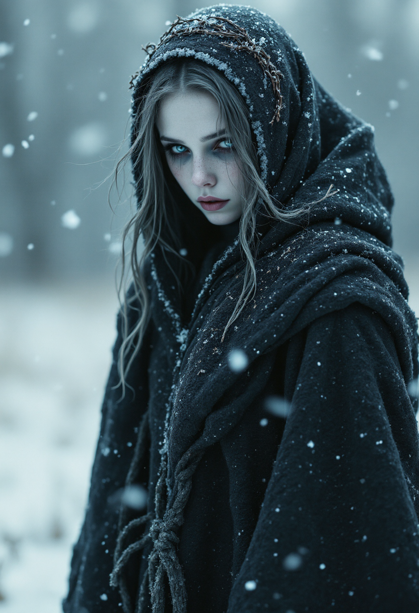 gothic style hyperrealistic art Cinematic photo in the style of Zdzislaw Beksinski of Marzanna, a beautiful Polish goddess embodying winter and death,27yo, with ashen hair and a malevolent expression, collecting souls while wearing threadbare garments adorned with patches of ice and frost. Her pale skin contrasts with a Crown of Thorns, and the scene is set against a winter field. The atmosphere is sinister yet enchanting, rendered in a photorealistic oil painting style with detailed textures and a cinematic feel. masterpiece, highly detailed, ultra-aesthetic composition. highly detailed background <lora:aidmaFLuxPro1.1_v0.3:0.8>