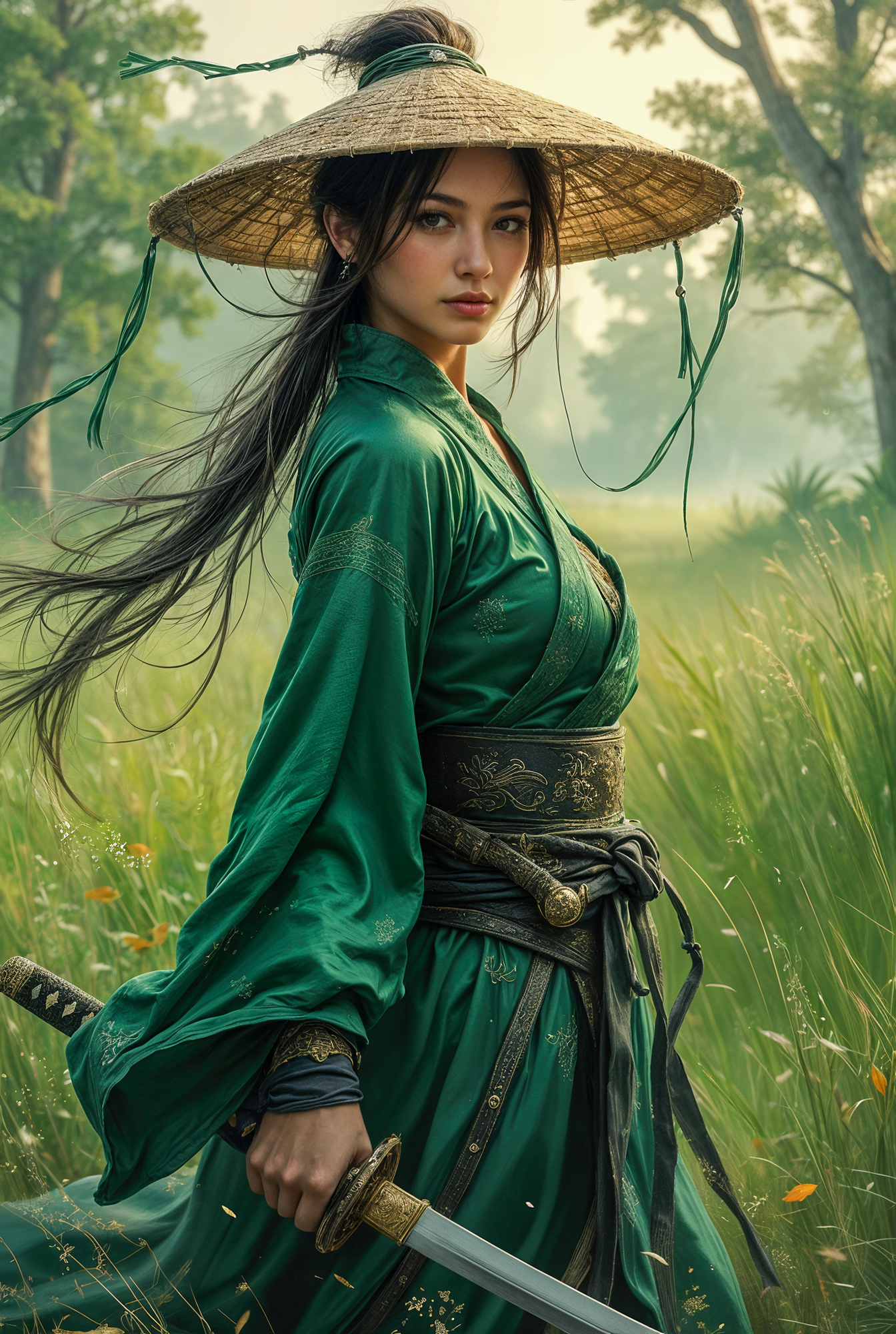 A graceful xia female martial artist in traditional Chinese attire, wearing a flowing green robe with intricate fabric textures, tied with a sash. She stands poised in a dynamic stance, gripping a finely crafted chinese sword with carved details. Her wide, woven straw hat with long ribbons frames her determined expression, as her focused gaze cuts through the serene backdrop. The setting is a tranquil meadow at dusk, with soft light filtering through misty trees, creating a mystical and atmospheric mood. Gentle winds ripple the fabric of her robes, adding motion to the scene. The color palette emphasizes earthy greens and muted browns, with cinematic lighting highlighting her stance and weapon. Digital painting, highly detailed, wuxia aesthetic, sharp focus on the character and weapon, dramatic yet serene ambiance.