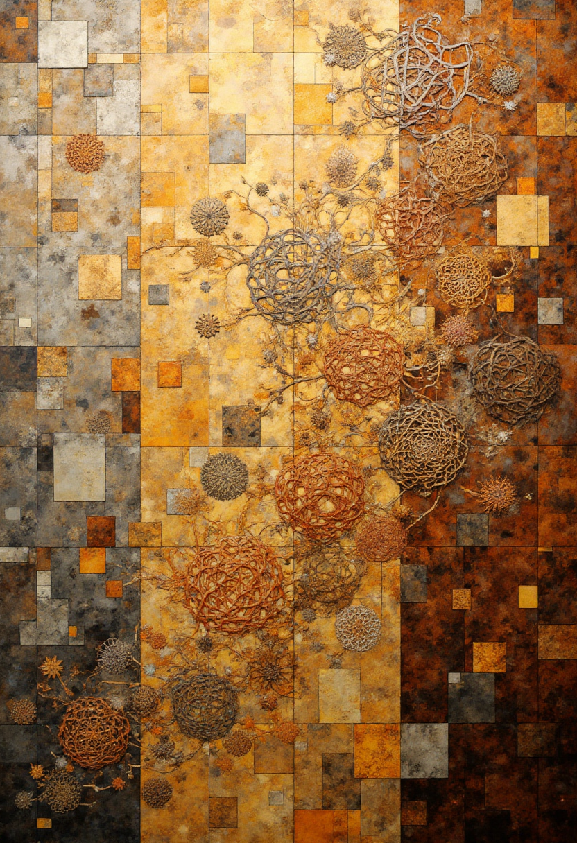 In this visually arresting scene of metal artistry, the seamless fusion of rich metallic tones, including dazzling gold, radiant silver, earthy bronze, and warm copper, creates a resplendent tapestry of color and light. Shadows dance gracefully across the intricate geometric forms, deepening the contrast and showcasing the masterful craftsmanship within each exquisite detail. A centerpiece of stunning interwoven patterns cascades along the lustrous surface, gracefully reflecting the soft, diffused illumination and casting flickering shadows. Each reflective angle presents a new visual treat, evoking feelings of awe as the complex patterns unfurl, evoking thoughts of intricate metallic sculpture art representing nature's fluidity. This artistic composition not only captivates the eye but also stimulates the mind with its rich textures and striking depth. ,<lora:flux/fav/Digital painting V1.safetensors:1.0:1.0>