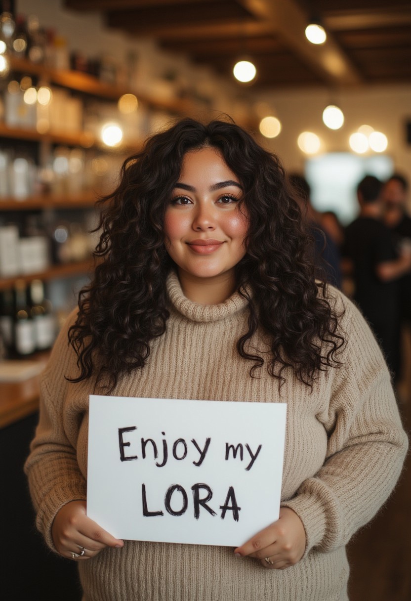 FictionalVera,a chubby homely latina woman, long curly hair, wearing a beige turtleneck, soft smile,holding a sign saying "Enjoy my Lora"