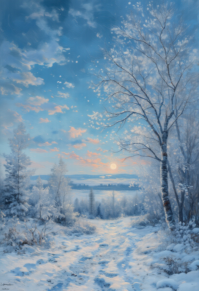Behold the poignant beauty of winter's first breath as we witness the birth of January. In this canvas, frozen mist blankets the landscape in a soft monochrome palette of silver and icy blue, setting the stage for a magical moment in time. Delicate snowflakes dance around a distant sun, illuminating the scene with fleeting rays of warm light, while the vast expanse above is dominated by an achingly serene cerulean sky dotted with fleeting whispers of clouds. In the foreground, a solitary birch tree stands proudly in defiance of the elements, its bare limbs reaching towards the heavens, adorned with delicate snow crystals that shimmer in the sun's gentle touch. Beneath its sheltering embrace, a whispering wind carries the scent of freshly fallen snow, promising an enduring tranquility that only winter's enchanting dance can deliver. In this moment, we are captivated by the essence of Januaryâthe eternal union between nature's stark majesty and humanity's quiet, introspective reverie. Craft this image as an oil painting with rich brushstrokes, conveying the depth and texture of the frozen world that lies before us. ,<lora:flux/fav/OBä¸ä¸çºªæ²¹ç»v1.1.safetensors:1.0:1.0>