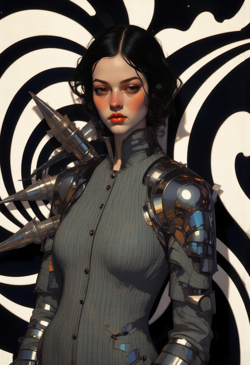 A hyper-stylized digital illustration of a Palestinian woman with warm olive-toned skin, sleek asymmetrical dark hair styled with sharp precision, and bold, sophisticated makeup featuring softly contoured cheeks, luminous bronze eyelids, and deep berry-toned lips that contrast beautifully with her piercing hazel eyes. She wears an avant-garde gown by *Iris van Herpen*, a masterpiece of metallic graphite-gray fabric with a tapered silhouette and cascading architectural folds. Bold chrome shoulder pads adorned with surreal, elongated silver spikes radiate outward, juxtaposing the soft organic curves of her gown with futuristic, angular elements. The high sculpted neckline frames her slender neck, while the gown’s shimmering iridescence highlights its intricate textures, adding an ethereal glow. Polished chrome cuffs on her wrists mirror the spikes, reinforcing the bold metallic theme. She stands against a dynamic background of black and white brushstroke-like lines that ripple organically, creating a harmonious yet striking contrast between natural fluidity and cutting-edge design, resulting in a composition that perfectly balances elegance and avant-garde intensity.