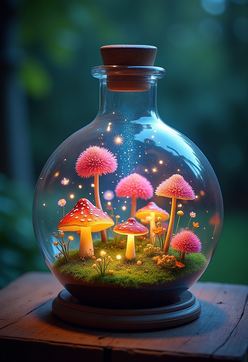 Hidden world inside of a round flask, filled with colorful flowers and glowing mushrooms