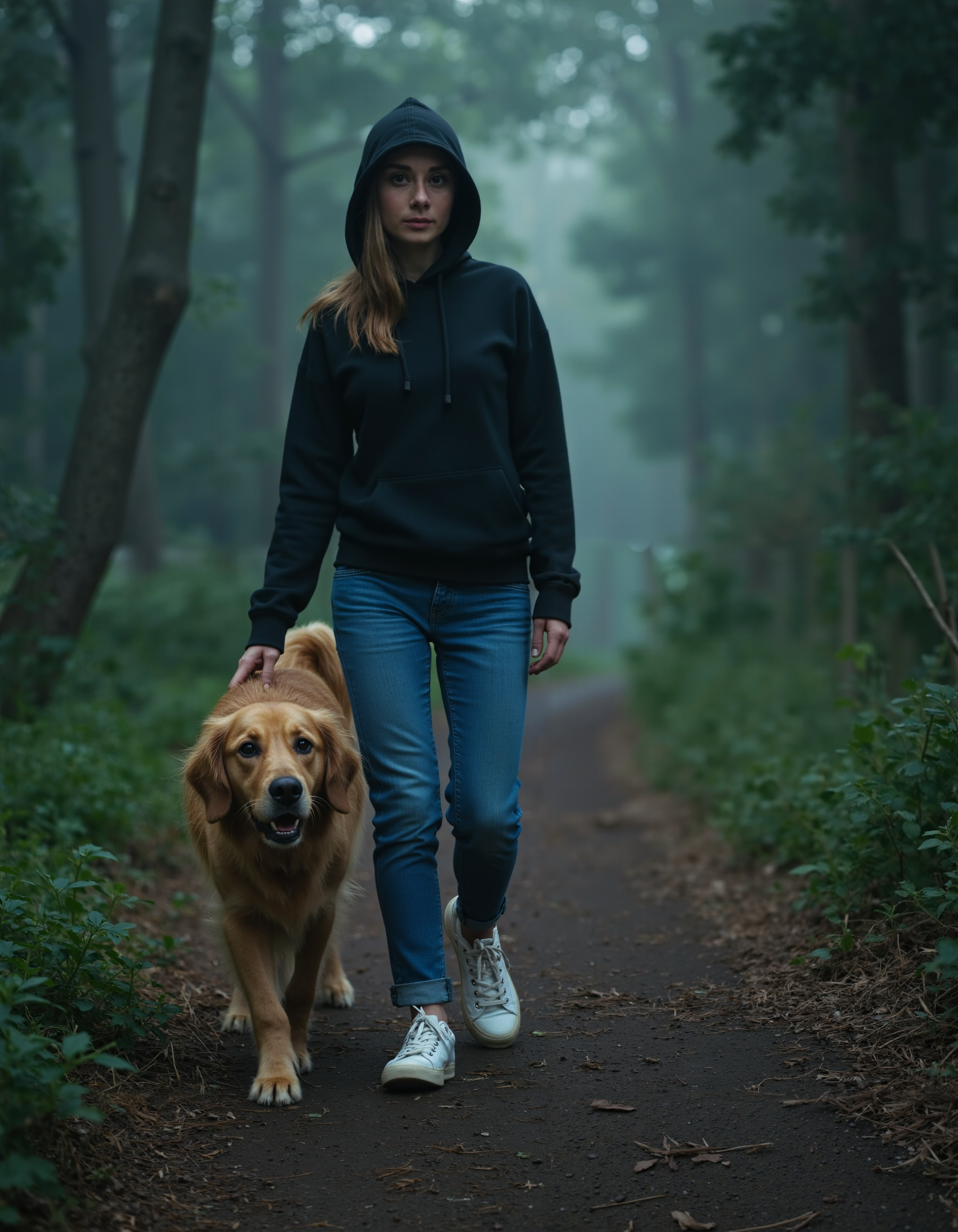 sks woman, a woman walking her dog, a golden retriever, towards the camera in a humid forest at dusk. She wears a jeans, sneakers and a hoodie over her head. Her lips are parted.