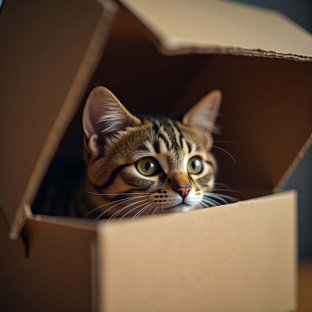 Close-up of a cat’s head peeking out of a box, eyes alert and scanning the surroundings, with soft, warm light adding to the cozy feel.