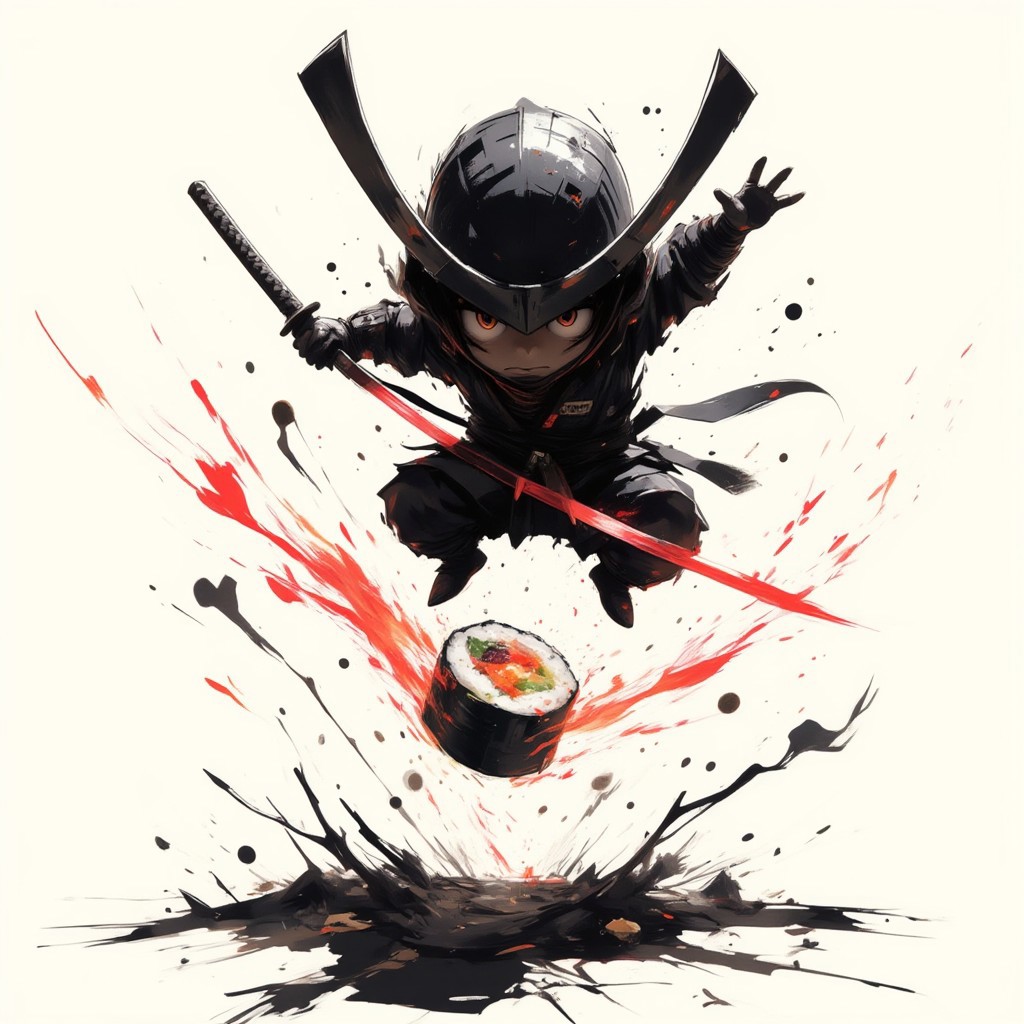 front view of a chibi samurai jumping and cutting in the air a roll of sushi with his katanas, ink strokes, dynamic, shadow, silhouette, black and white, monochrome, red accents, dramatic lighting, atmospheric, japanese culture, minimalist, contrast, sunset glow, isolated figure, reflective pose,pscho_4rt, stylized