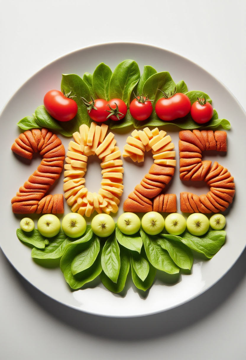 <lora:Food_Formations_FLUX-000016:1> This is a photograph showcasing a meticulously arranged plate of food art, designed to resemble the text "2025".