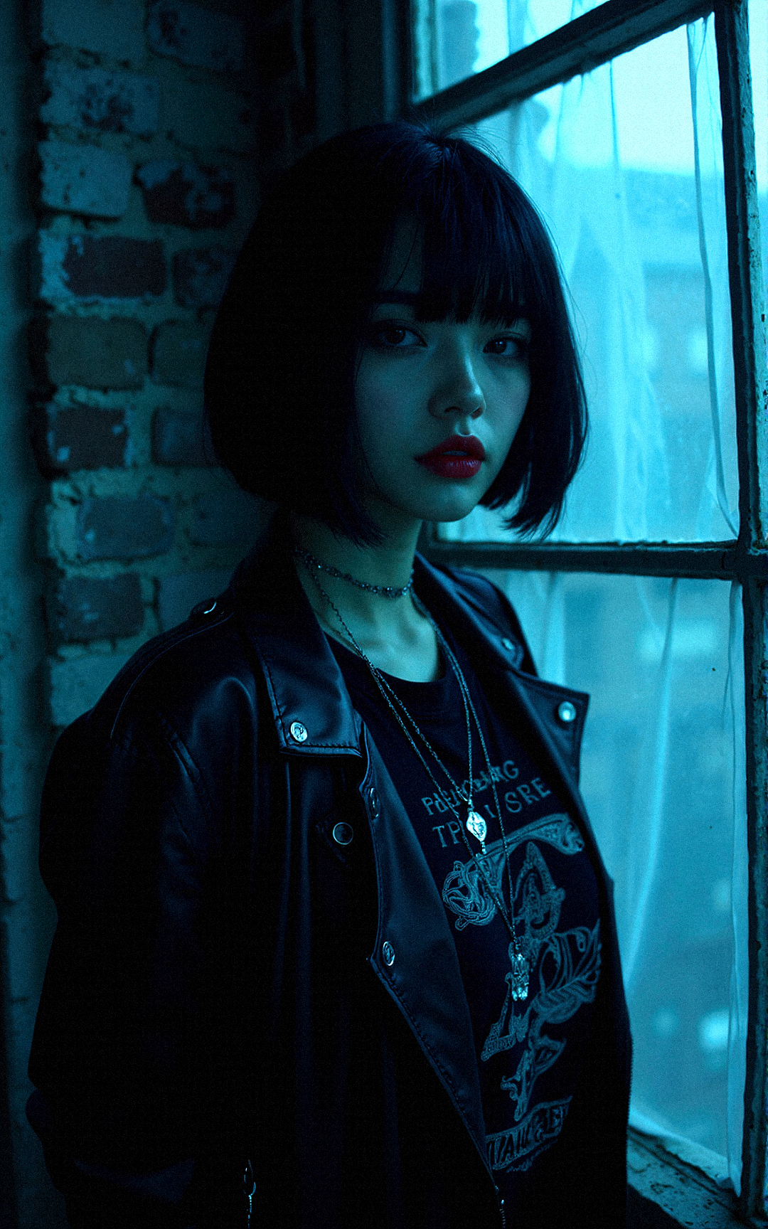three-quarter shot portrait, extremely photorealistic photography, woman with an intense gaze inside a softly lit room near a large open window, sheer curtains billowing gently in the night breeze. Her sharp black bob frames her pale face, accentuating her piercing eyes and dark lipstick. She wears a sleek black leather jacket over a graphic t-shirt, paired with a delicate silver necklace that glints in the moonlight. The dim blue tones of the room, textured brick walls, and subtle floral shadows cast by the curtain add a mysterious and cinematic depth to this three-quarter portrait. Leaning slightly forward with both hands clasped behind her back.