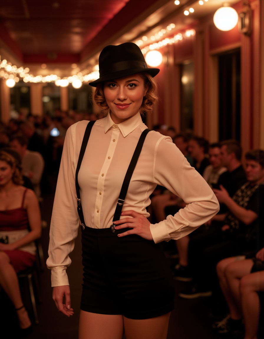 A cozy jazz club hall in the style of the 1930s. In the foreground, jazz burlesque dancer Tall slender athletic woman are very close. wide hips. White blouse, High-necked blouse, fully clothed, hat, black shorts, suspenders. (pulled the suspenders). A dynamic pose. There is playful surprise on face. Laughing and flirting. In the background, musicians are out of focus, an elite well-dressed audience... The photograph immortalizes her as a figure of elegance and quiet power, her piercing gaze and flawless style making her an unforgettable presence within the Mediterranean dreamscape. (Depth of field), low saturation,detail. mythp0rt, charismatic., ,,. masterpiece, best quality, dramatic lighting. . woM4ry3l1