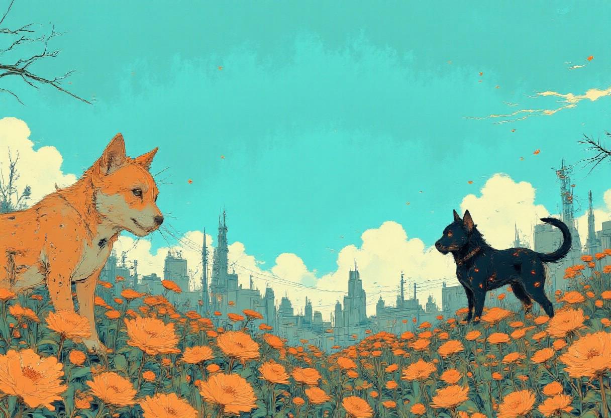 A surreal and dynamic scene, a group of cats and dogs in the middle of an open wild land. The background features a vast, dystopian landscape extending into the horizon, painted with a soft gradient of blues and subtle ripples, contrasting the chaos of the foreground. Above, a clear blue sky with wispy, scattered clouds enhances the feeling of openness and freedom. The lighting is natural and bright, emphasizing the details of the cats and dogs textured skin, shiny fur, and the reflective surface of the land. The scene balances a realistic depiction of the atmosphere creating an amusing and imaginative visual. This imaginative artwork blends humor, action, and surrealism, drawing the viewer into an unusual and entertaining adventure.