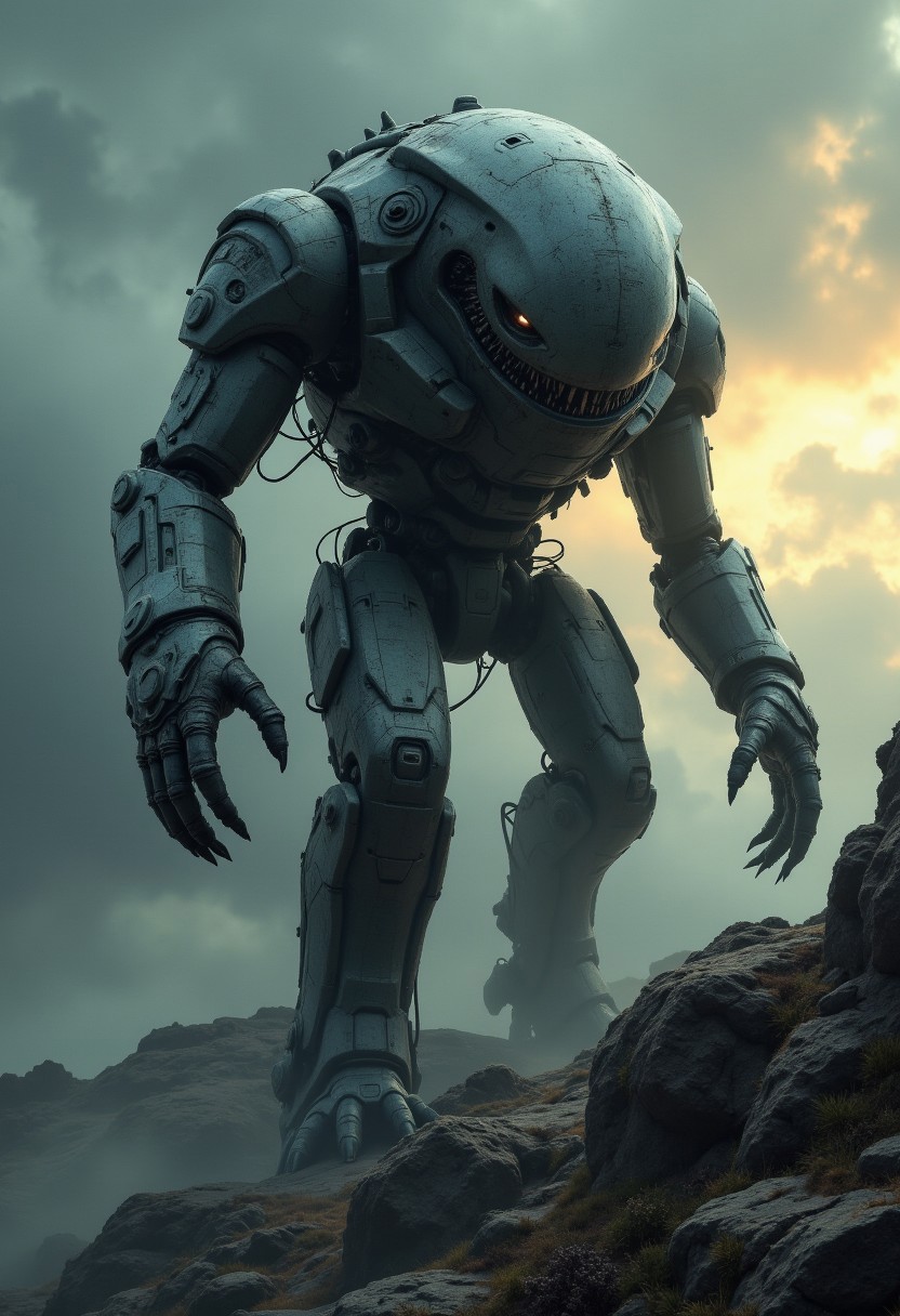 aidmafluxpro1.1, a high quality digital image of a large intricately detailed robot-like creature standing on top of a rocky cliff. The creature appears to be made of metal and has a dark, ominous appearance. It has a large head with two large eyes and a small mouth, and its body is covered in armor. The background is a cloudy sky with a hint of orange and yellow, giving the impression of a stormy sky. The overall mood of the image is ominous and foreboding.