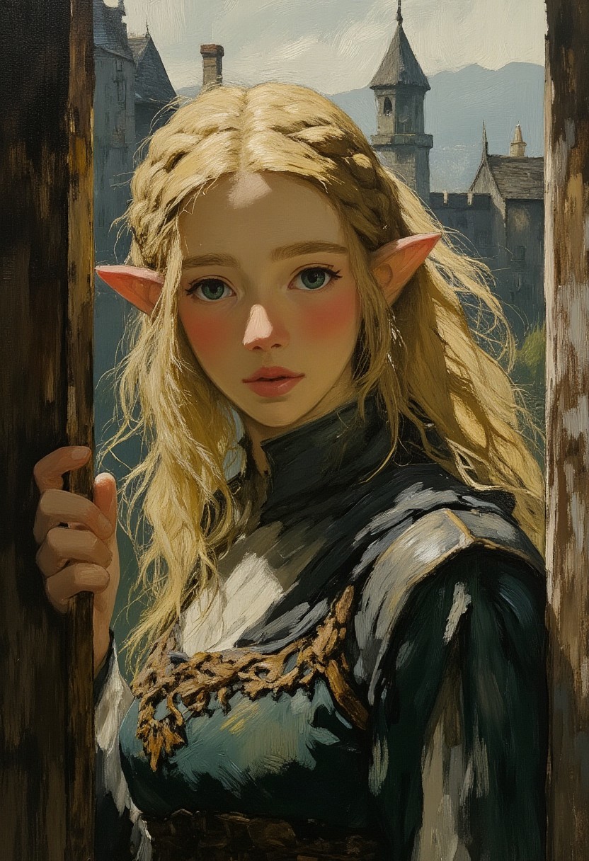 masterpiece, high quality, Oil Painting, Hyper-realistic, hyper-detailed picture of a petite young female Z3ld3k1ck1x with a proud look on her face. The she has porcelain white skin, long flowing blond hair, and bright emerald green eyes. The she is wearing plain 1500s full plate mail armor that shows signs of wear and use. The she is standing inside the front gate of a castle the towers of which can seen behind her. The painting shows shadow and light, Masterpiece, intricate lines, intriguing atmosphere, sharp magnificent details, delicate features, elaborate details, (2\3 rule composition:0.5), ultra detailed, romantic, Rembrandt lighting, brush stroke, lovely, del1cate_balance style, novuschroma, in the style of Rembrandt. vantablack
