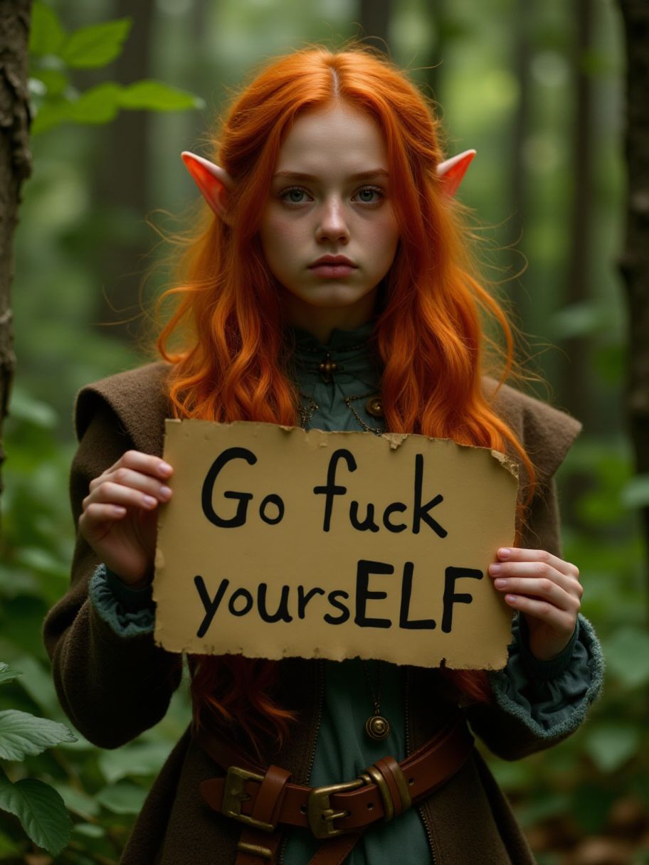 A portrait of a elf holding a sign, with "Go fuck yoursELF" written on it, in the forest, long red hair, elf ears, bit grumpy, <lora:Copax_Realistic_Dreamlight_fp8:0.8>