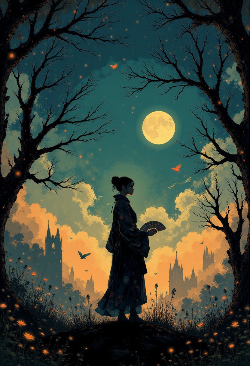 Illustration, A majestic woman perched atop an ancient stone pedestal, surrounded by a mystical forest bathed in a soft, glowing light. The woman's clothes shimmer with hints of silver and gold, as though enchanted by magic. Its large, wise eyes glimmer with an ethereal glow, reflecting the shimmering stars above. In the background, towering trees are draped with glowing runes, and the air is filled with floating wisps of magical energy. A distant castle with spires and glowing windows looms on the horizon, while arcane symbols and soft mist swirl around the owl, creating a magical atmosphere. The sky above is a deep indigo, with twinkling stars and a crescent moon. The entire scene feels as if it’s part of a wizard’s realm, filled with mystery and wonder. Ethereal landscapes, Concept art, VR painting, imaginative worlds, digital illustration, dystopian landscapes, surreal compositions, vibrant colors, dynamic dramatic atmosphere, dynamic cinematic color, flowing, best, unique