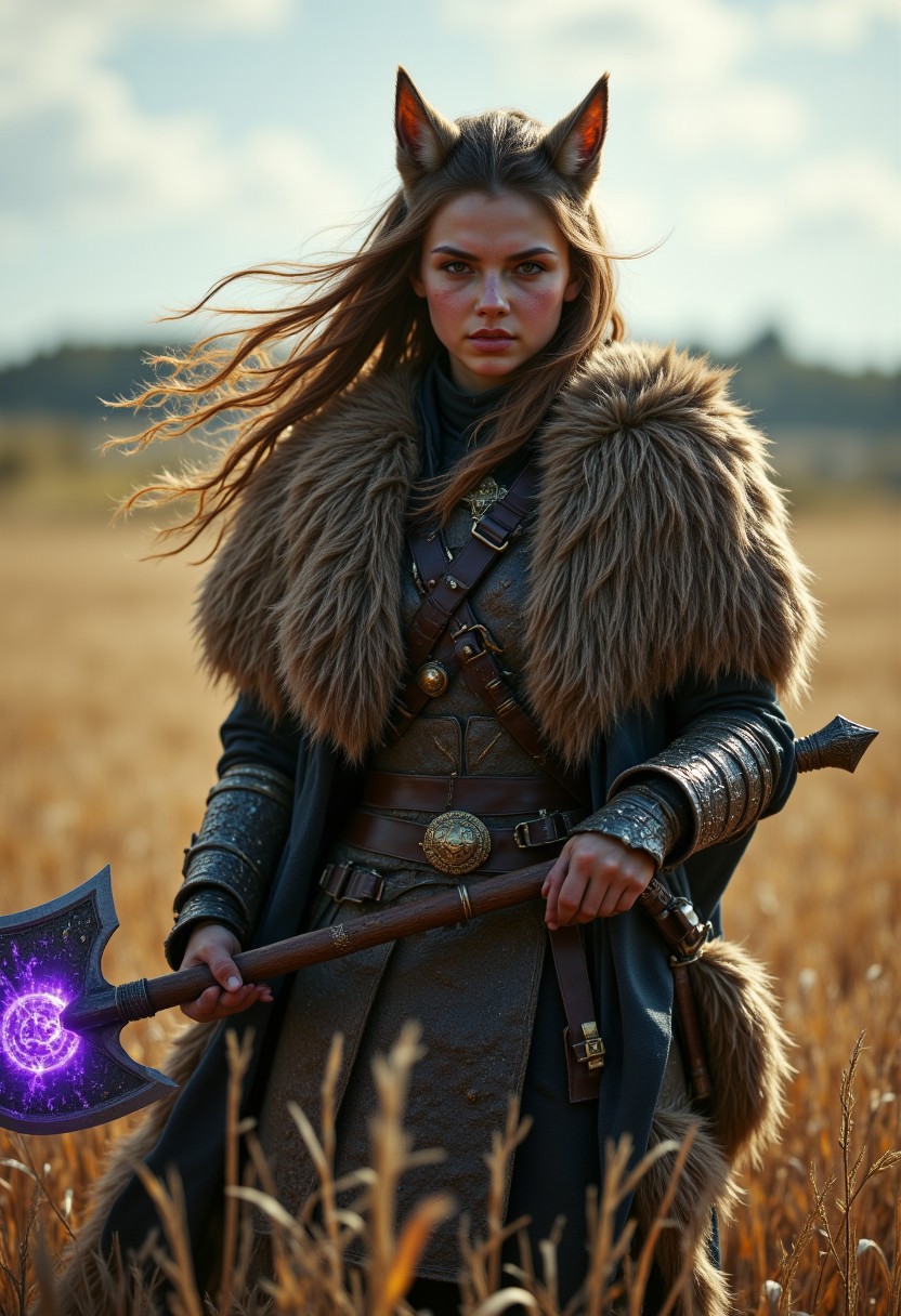 R3alisticF, viking girl wearing a wolf pelt with shoulder armor, she's holding a axe glowing with purple energy, her long hair is flowing in the wind, she stands in a field training for her next battle. (maximum ultra high definition image quality and rendering:3), maximum image detail, maximum realistic render, (((ultra realist style))), realist side lighting, , 8K high definition, realist soft lighting, <lora:FluxMythR3alisticF:1>