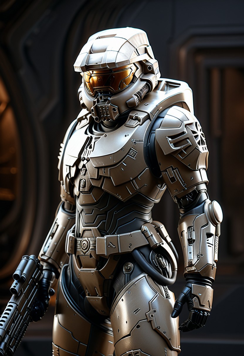 high-resolution sepia photograph of female space marine in SilverPulse armour, hyperdetailed helmet, holding an assault rifle, dark abstract background suggesting interior of spaceship, dutch angle, dynamic, side view