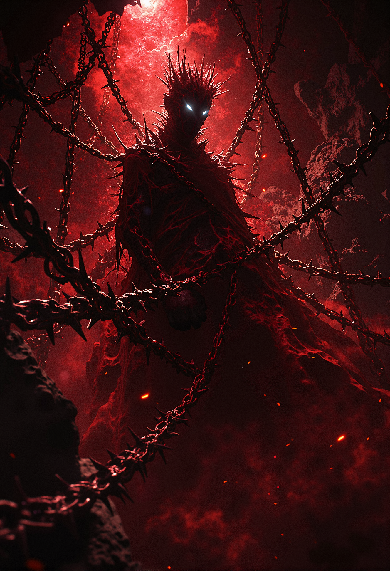A haunting, surreal scene of a figure fully cocooned in spiked chains, suspended in a dark, crimson-lit void. The jagged chains stretch outward in every direction, their barbs glowing faintly in the oppressive red haze. Mist and shadows weave through the composition, heightening the otherworldly atmosphere. The glowing red light accentuates the sharp metallic texture of the chains, creating a suffocating and nightmarish environment that exudes dread and despair. <lora:Elden_Ring_-_Yoshitaka_Amano.safetensors:1.0>, <lora:black_fantasy.safetensors:1.0>,