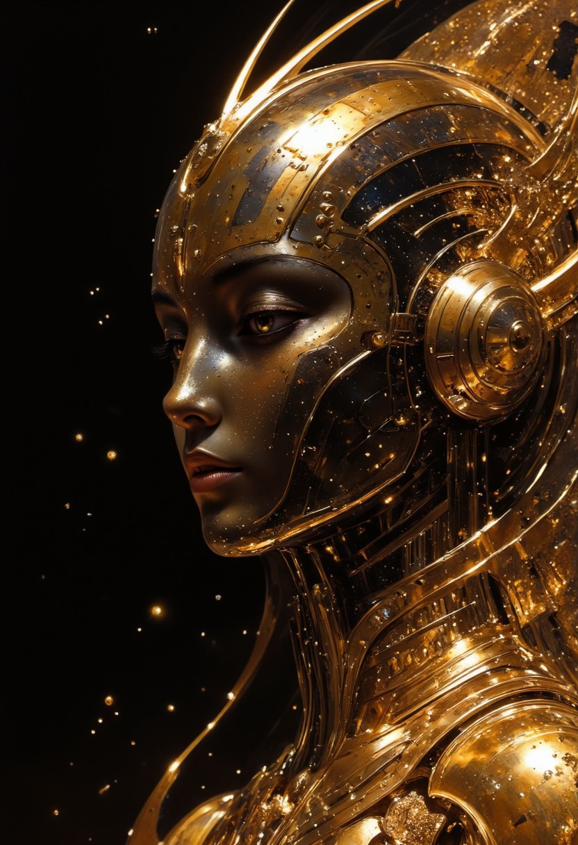 A detailed close-up of a woman's face, with golden skin and golden powder hair. She has glowing, iridescent golden eyes that seem to shimmer with cosmic energy. Her skin is speckled with tiny, glowing particles that resemble stars. She wears a golden dress. Her lips are glossy and gorgeous, while her expression is calm and otherworldly. The image is set against a deep starry night sky, with flecks of light mimicking distant stars, creating a cosmic and surreal atmosphere. The style is highly detailed, with a digital art feel, using a vibrant palette of blacks and glowing yellows. Soft, dreamlike lighting enhances the mysterious and celestial mood of the image. <lora:artisketchyfs-v02:0.83> <lora:FLUXRetroSciV3:0.53> RetroSci style, <lora:flux.1_lora_flyway_Epic-Characters_v1:0.43>