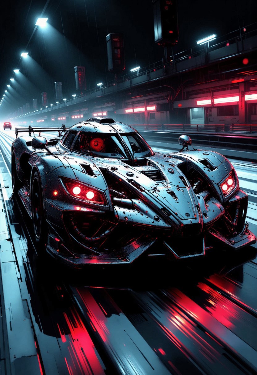 inksketch, silhouette art, chiascuro, a_skynet_cyberdyne_systems_craft, the image is featuring an armored futuristic hypercar, adorned with intricate, metallic details, including bolts, wires, and mechanical components, giving it a highly advanced, industrial look, with glowing red diodes and LEDs, travelling at speed on a cyberpunk superhighway, viewed diagonally from the front, motion blur, in darkness, illuminated by a neon streetlights