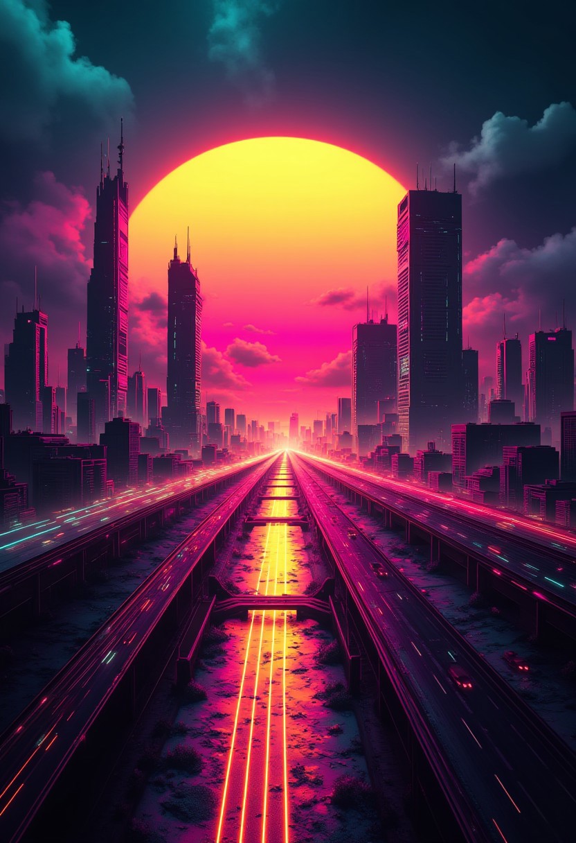 ck-rw, in the style of ck-rw, image of futuristic sci-fi city, with towers and skyscrapers, superhighways, silhouetted at sunset, stormy sky