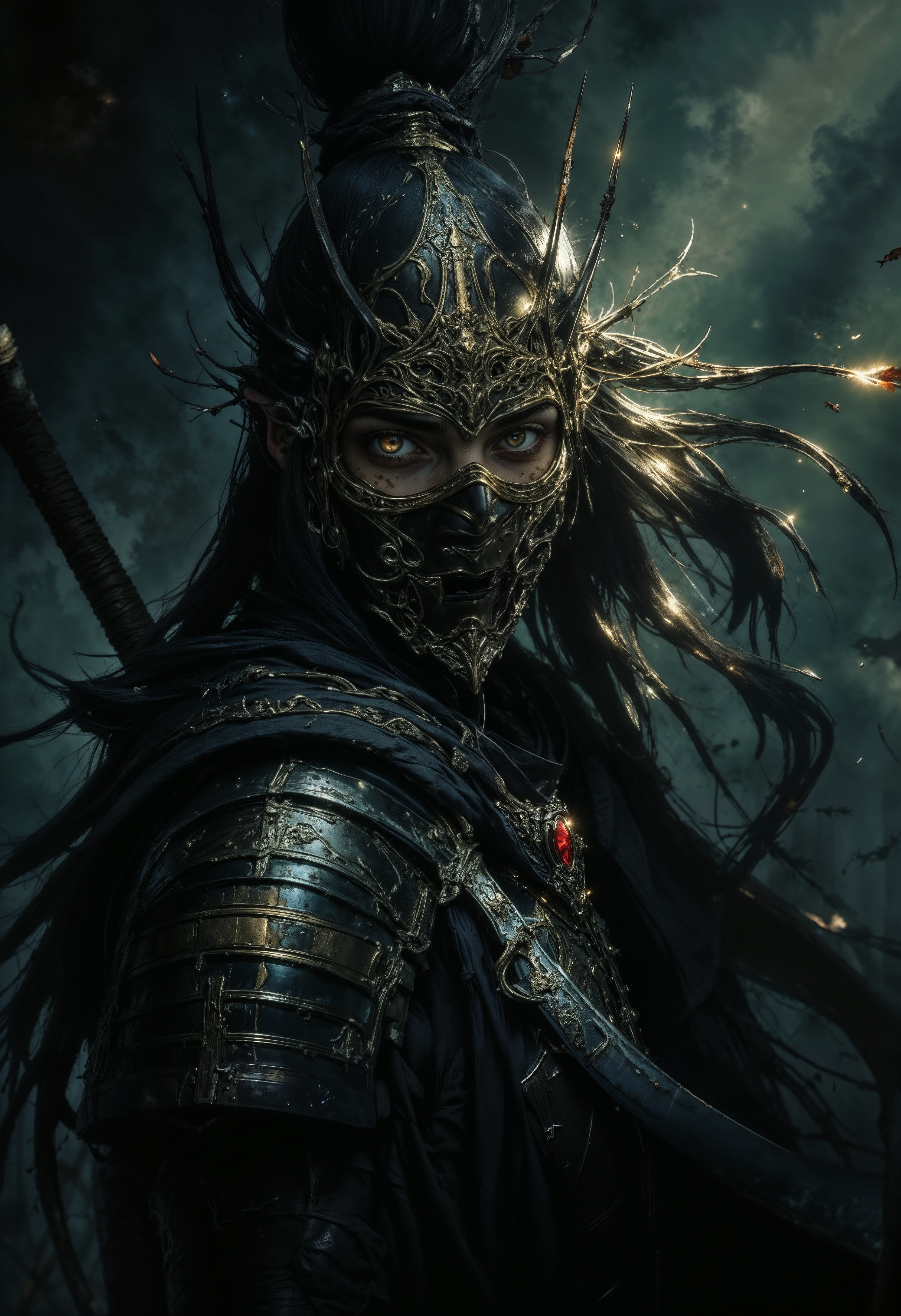 elf princess, warrior, fog-laden forest, large sword, gold chains, emerald eyes, sword glowing, plate armor, autumn leaves, wind. , the dark and moody background adds a dramatic tone, with subtle lighting highlighting metallic surfaces. (maximum ultra high definition image quality and rendering:3), maximum image detail, maximum realistic render, (((ultra realist style))), realist side lighting, , 8K high definition, realist soft lighting, (amazing special effect:3.5). S1n0z1ck style, mythp0rt, samurai