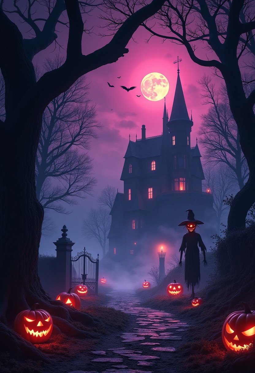 An eerie, breathtaking Halloween night scene in a haunted forest. Massive, ancient trees with twisted, gnarled branches reach toward a deep purple sky illuminated by a glowing blood moon. Thick, rolling fog carpets the forest floor, and jack-o'-lanterns with flickering, sinister grins are scattered along a winding path. The air feels thick with magic, as ghostly wisps of light drift through the trees. In the distance, a looming, decrepit haunted mansion stands on a hill, with flickering candlelight visible through cracked windows. Bats swirl around the turrets, and skeletal figures linger near the wrought-iron gate. The lighting is cinematic, with shadows stretching long across the misty ground, casting an ethereal glow on the pumpkins. A spooky scarecrow with glowing red eyes watches from a corner of the scene, adding an ominous presence. The atmosphere should be both beautiful and haunting, with rich, vivid details, 16k resolution quality to capture the intricate textures of the mist, the old wood, and the glowing moonlight.