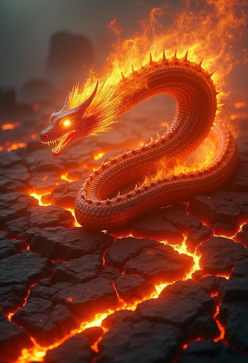 A majestic, fiery serpent slithers across a cracked, molten lava landscape, its scales glowing with intense shades of gold, crimson, and orange, as if forged from the heart of the earth itself. With each movement, the ground trembles beneath it, sending sparks and embers into the air. The serpent’s glowing eyes burn with an ancient, otherworldly power, reflecting a fierce, magical intelligence. It hisses as it exhales a torrent of fiery breath, igniting the air with a blinding burst of flame that lights up the charred ground. The lava crackles and pulses with energy beneath its body, while the surrounding terrain glows in the fiery light of this mythical creature, a living force of destruction and magic